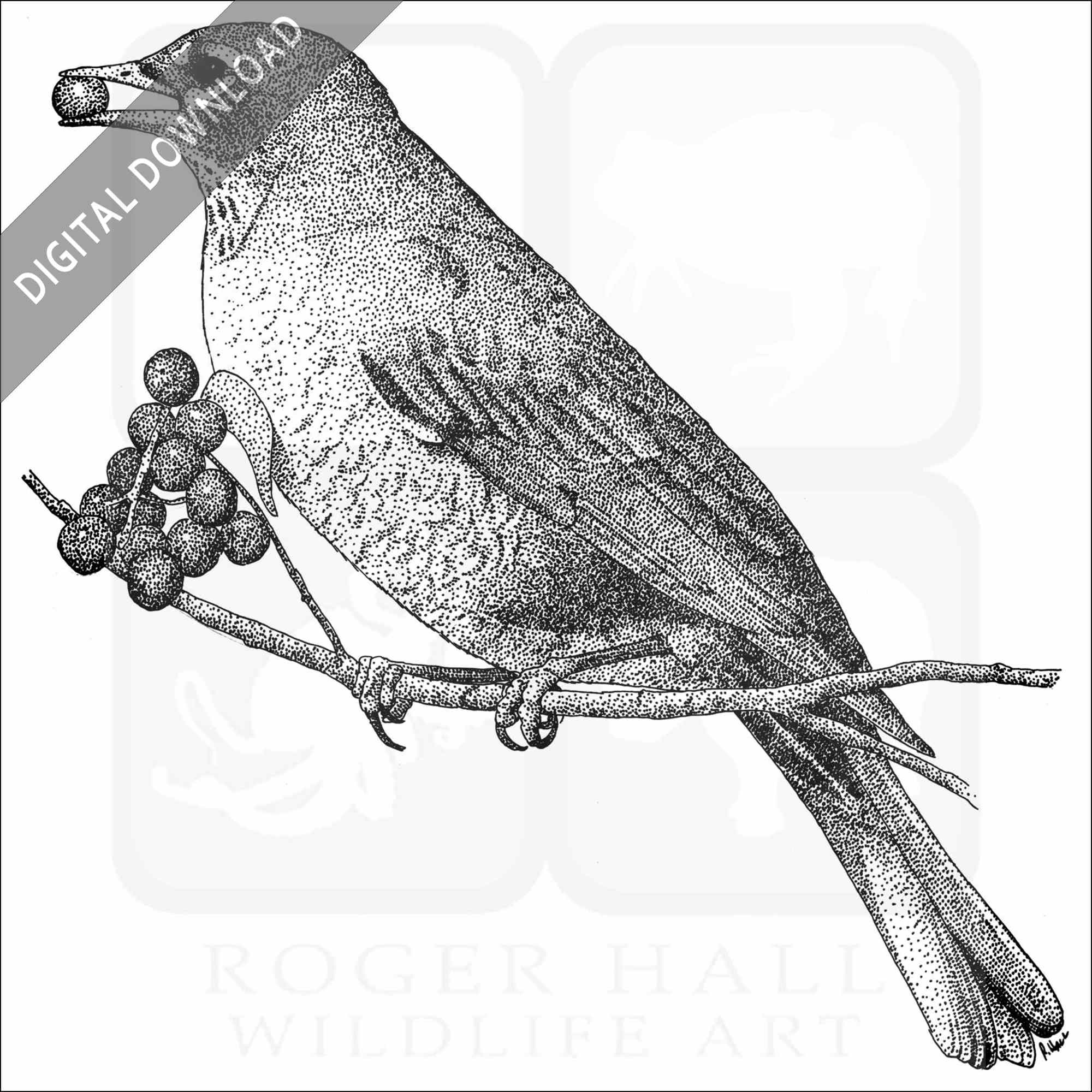 Stock art illustration of an American Robin (Turdus migratorius.) The illustration is available in black and white or color for immediate download.