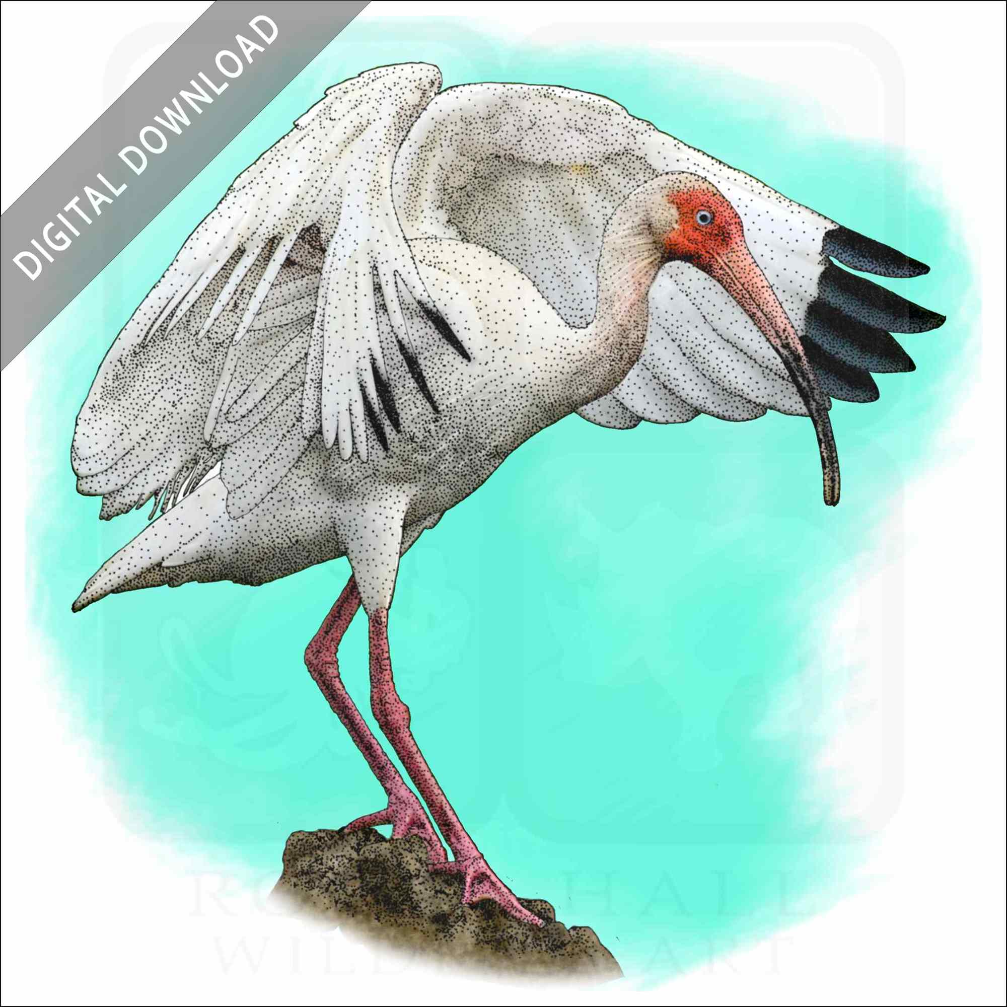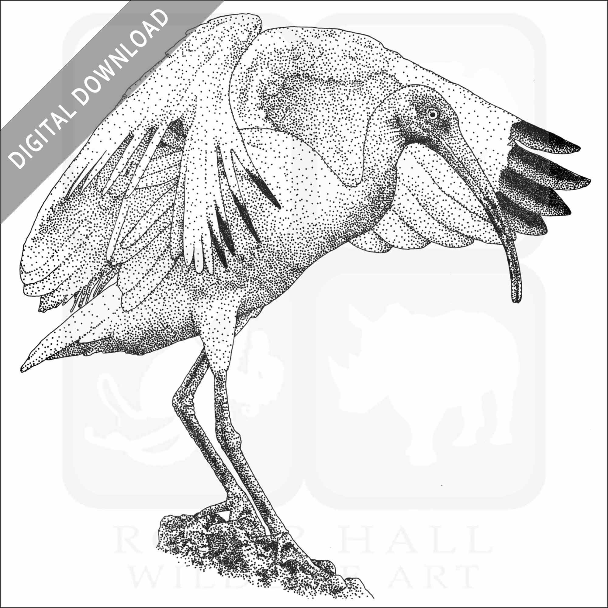 Stock art illustration of an American White Ibis (Eudocimus albus.)Â The illustration is available in black and white or color for immediate download.