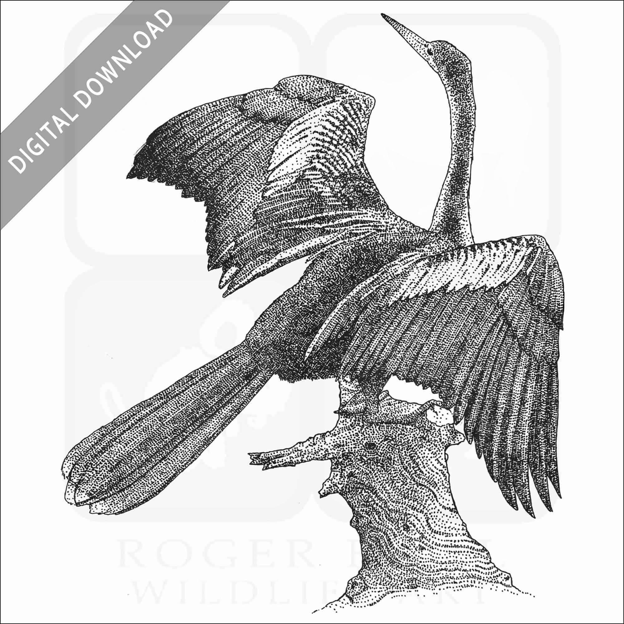 Stock art illustration of an Anhinga (Anhinga anhinga.) The illustration is available in black and white or color for immediate download.