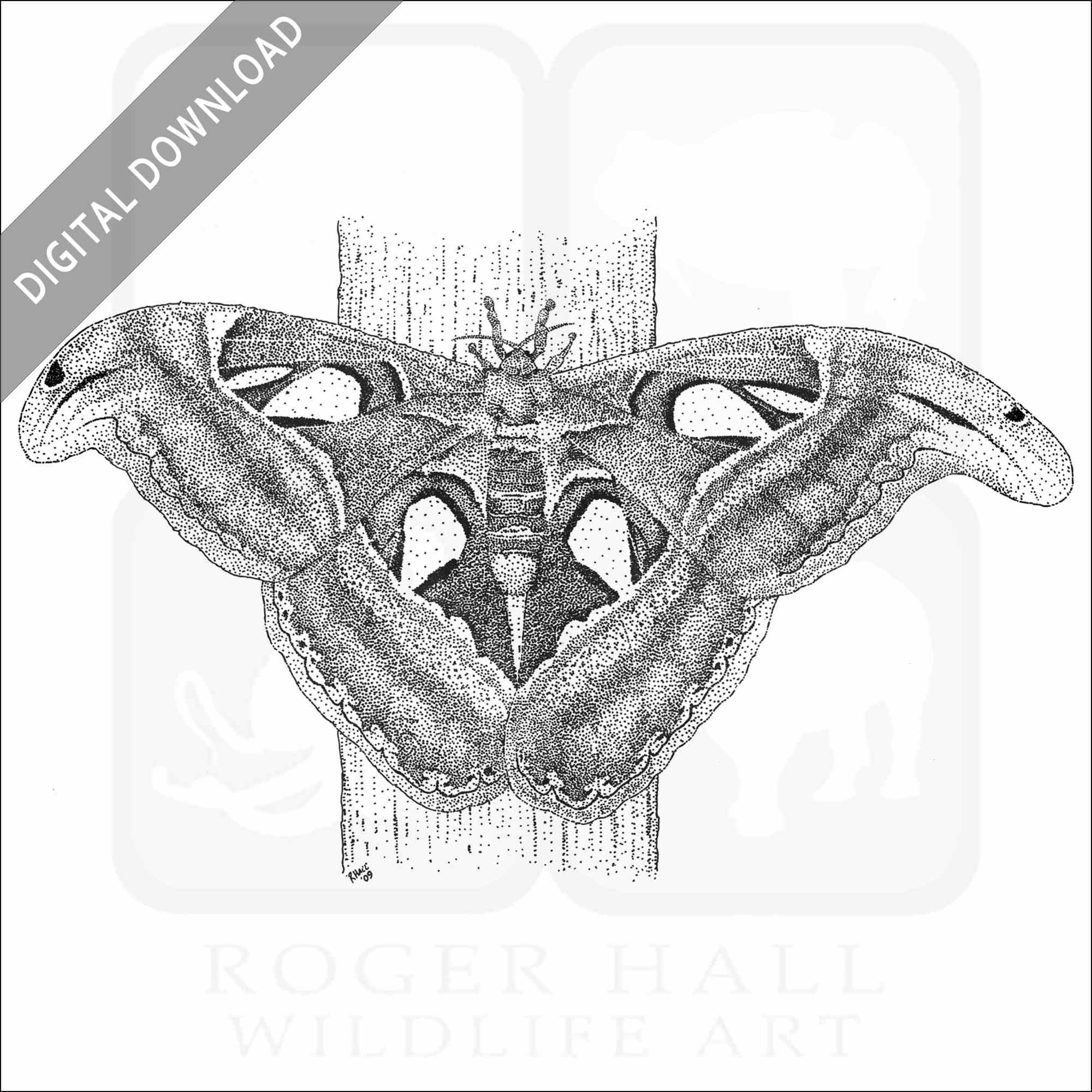 Stock art illustration of an Atlas Moth (Attacus atlas.) The illustration is available in black and white or color for immediate download.