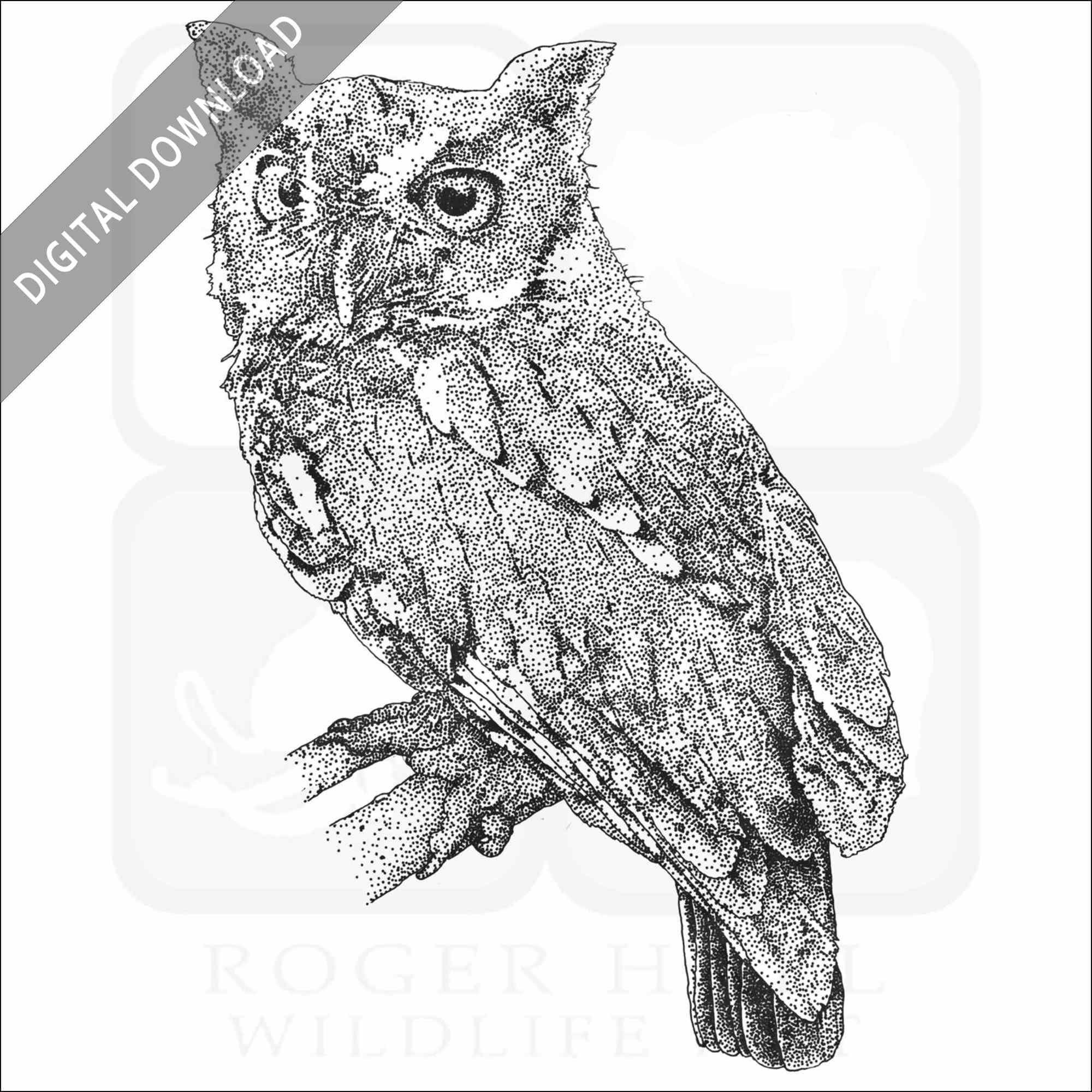 Stock art illustration of an Eastern Screech Owl (Megascops asio.)Â The illustration is available in black and white or color for immediate download.