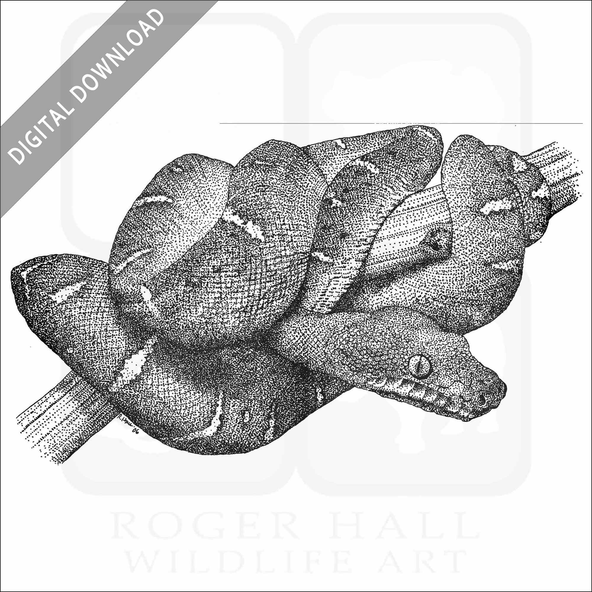 Stock art illustration of an Emerald Boa (Corallus caninus.) The illustration is available in black and white or color for immediate download.