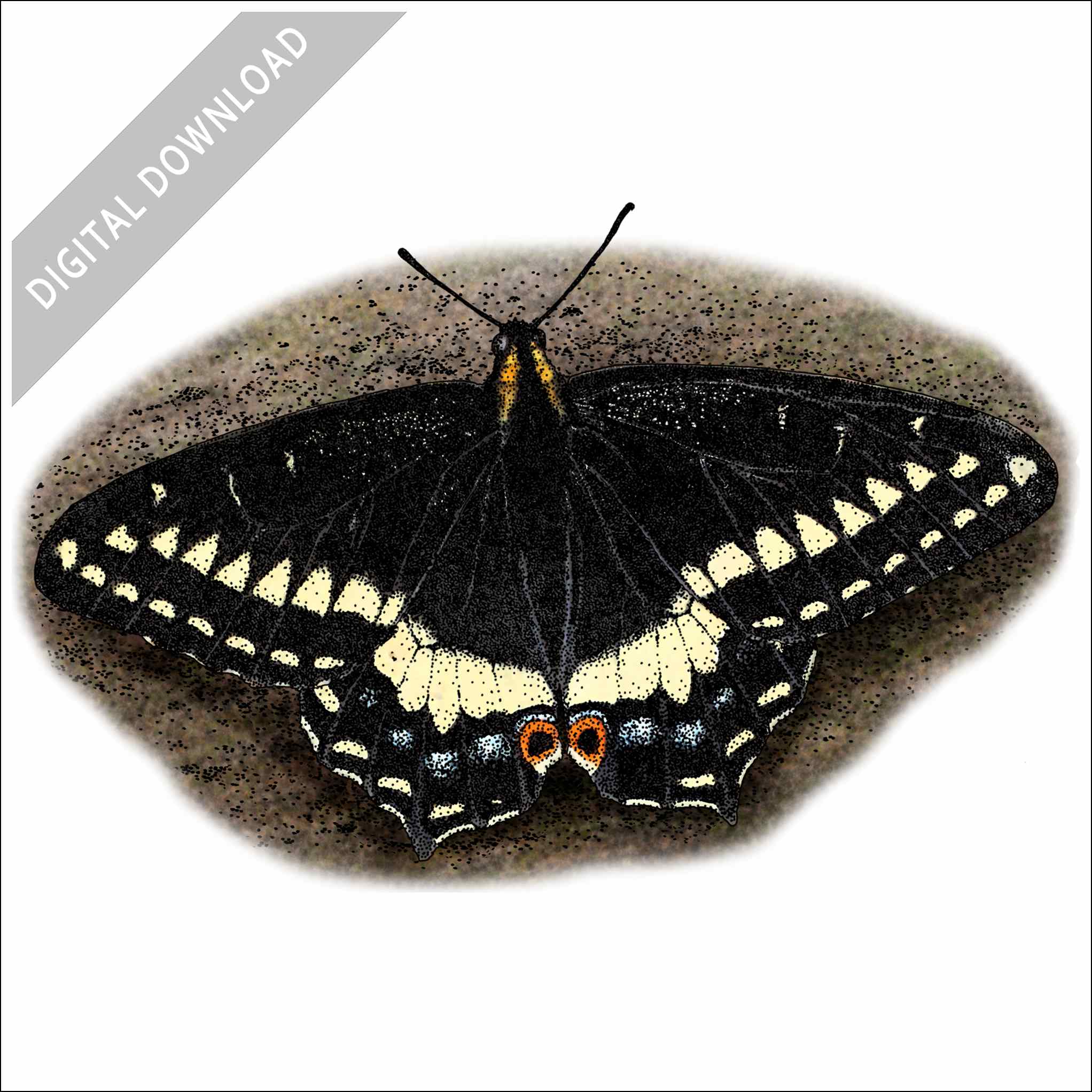 Stock art illustration of an Indra Swallowtail Butterfly (Papilio indra.) The illustration is available in black and white or color for immediate download.