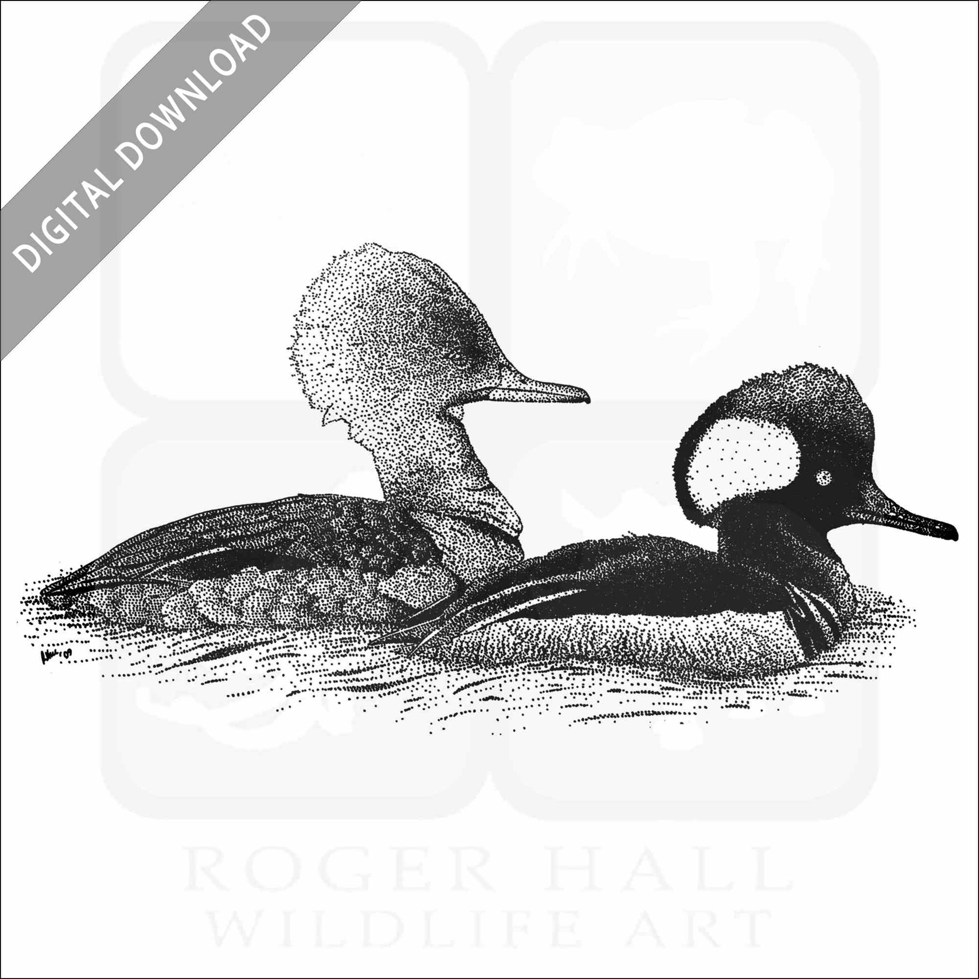 Stock art illustration of a pair of Hooded Mergansers (Lophodytes cucullatus.)Â The illustration is available in black and white or color for immediate download.