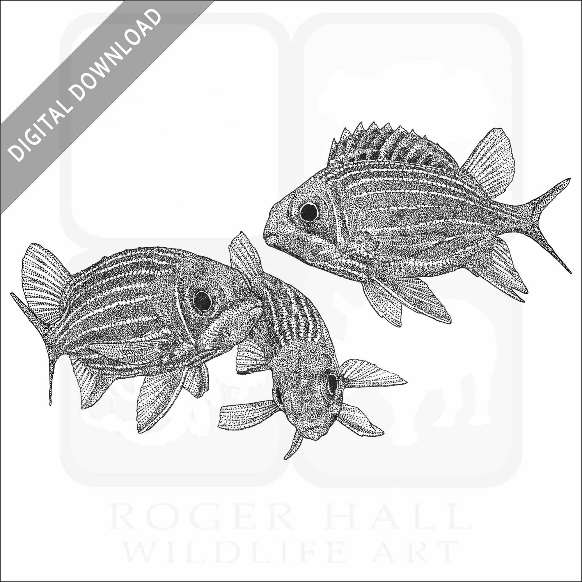 Stock art illustration of a small school of Striped Squirrelfish (Sargocentron xantherythrum.) The illustration is available in black and white or color for immediate download.