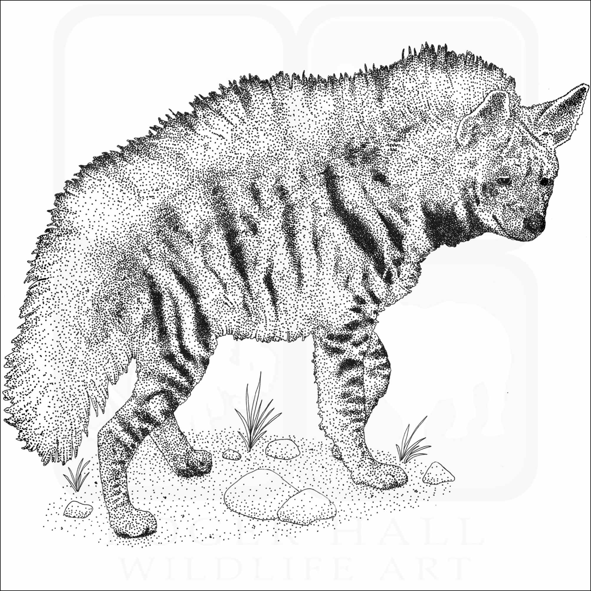 Fine art illustration of a Striped Hyena (Hyaena hyaena.) The illustration is available in black and white or color.
