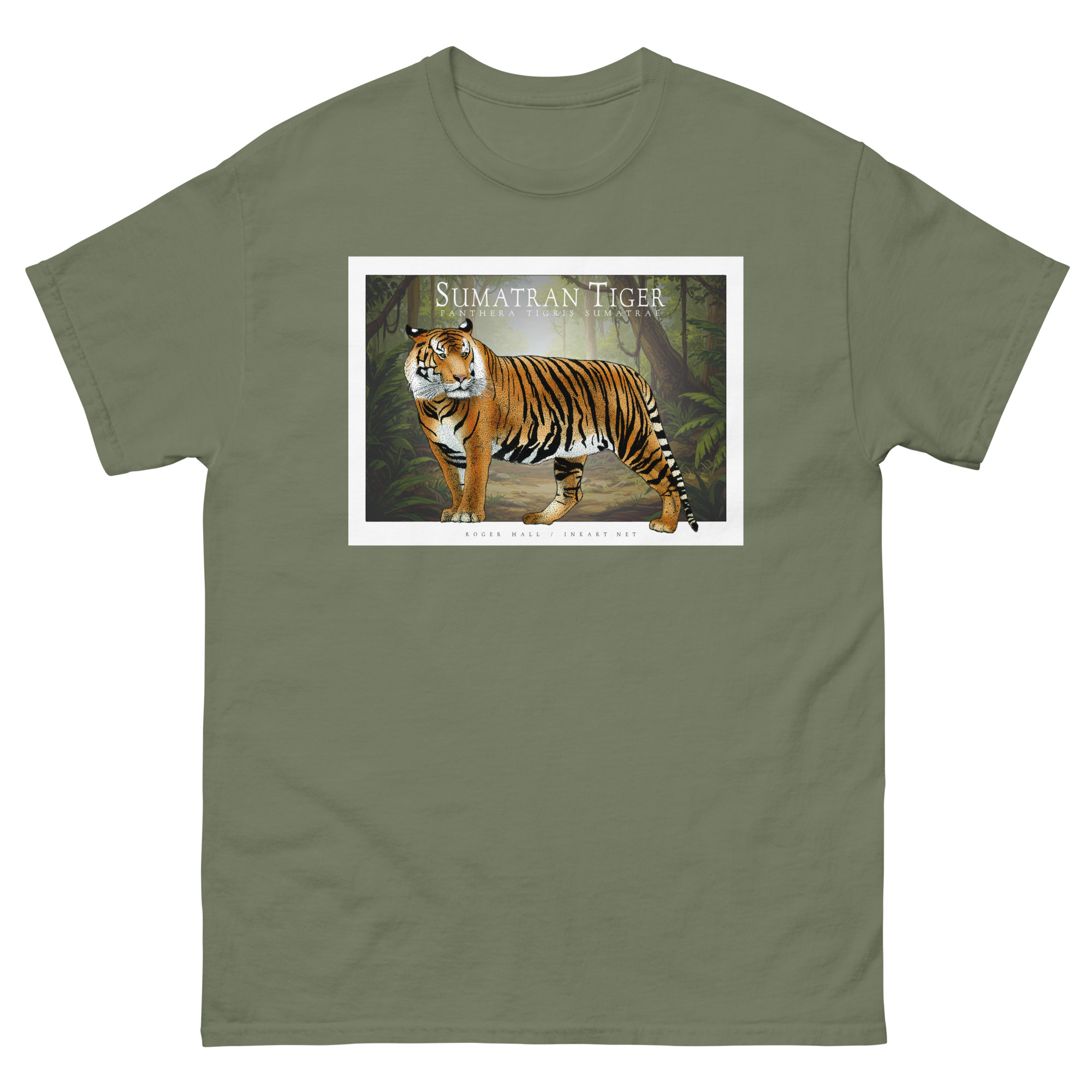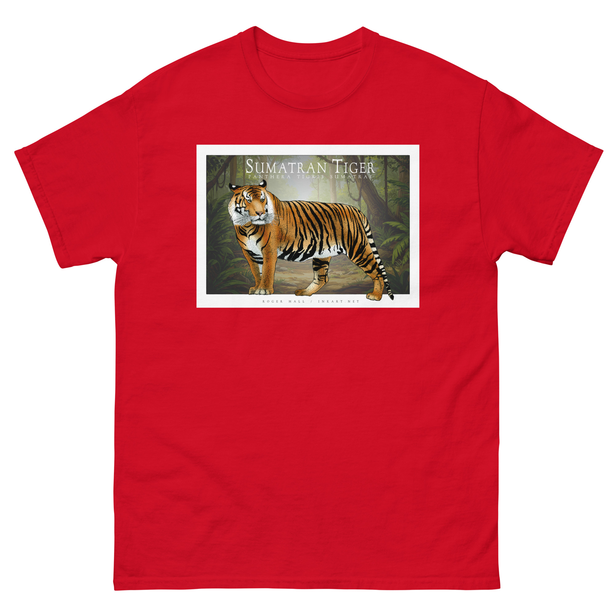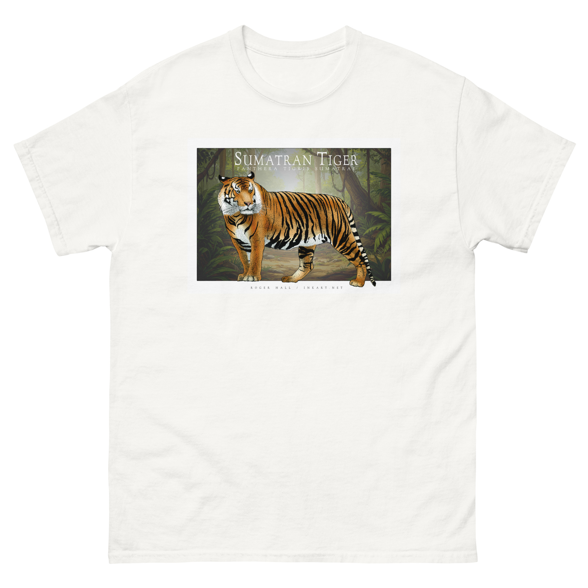 Scientifically accurate drawing of a Sumatran Tiger (Panthera tigris sumatrae.) The illustration of a printed on a high-quality 100% unisex cotton t-shirt.