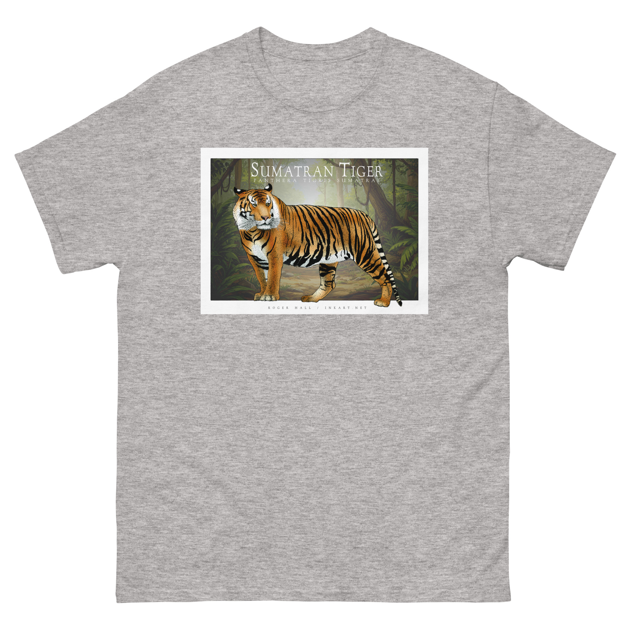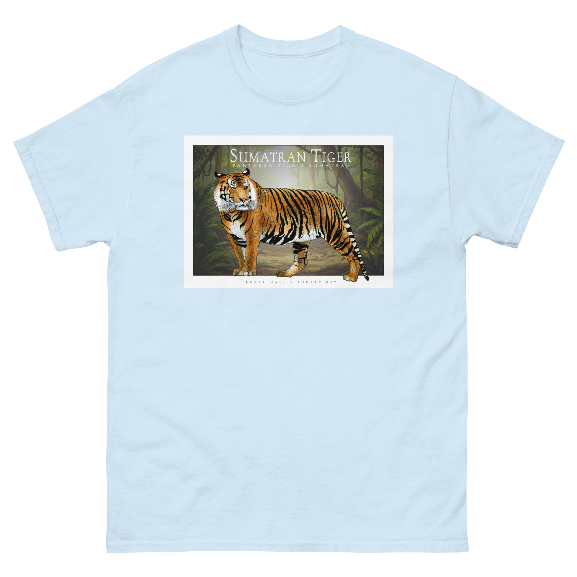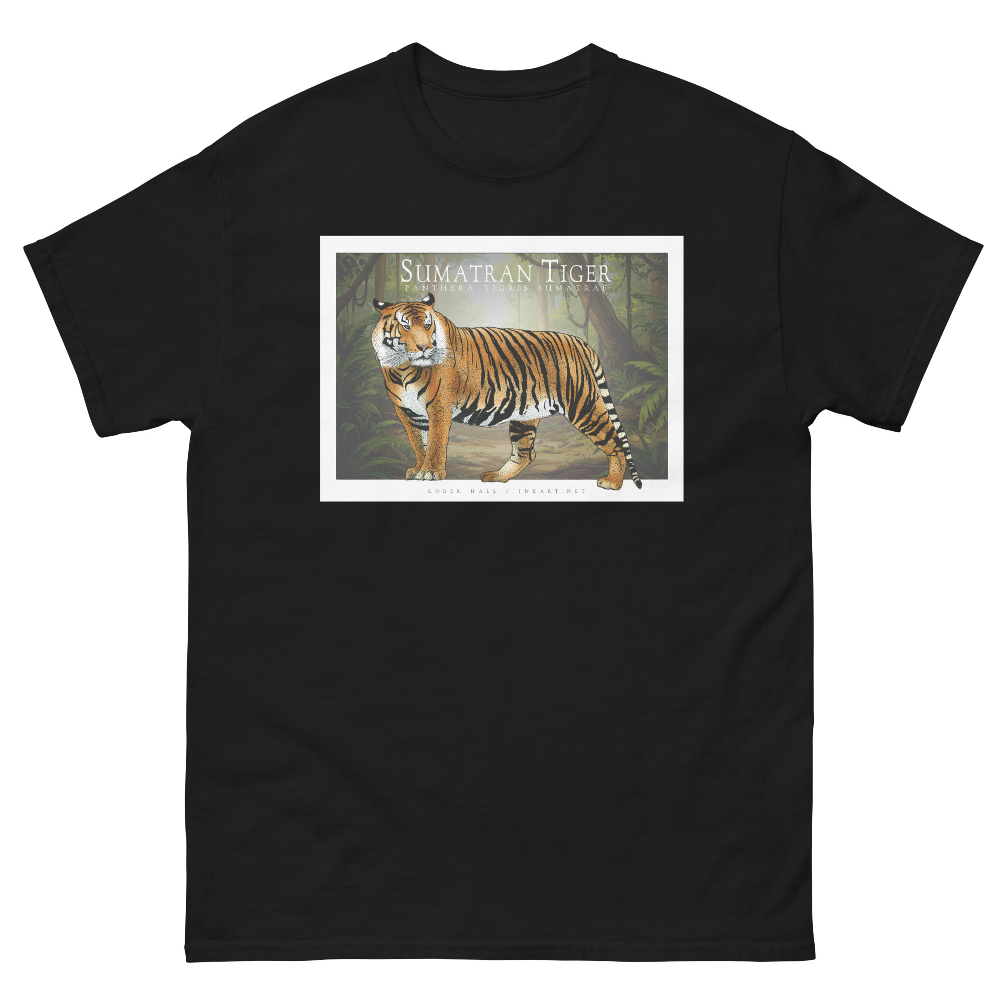 Scientifically accurate drawing of a Sumatran Tiger (Panthera tigris sumatrae.) The illustration of a printed on a high-quality 100% unisex cotton t-shirt.