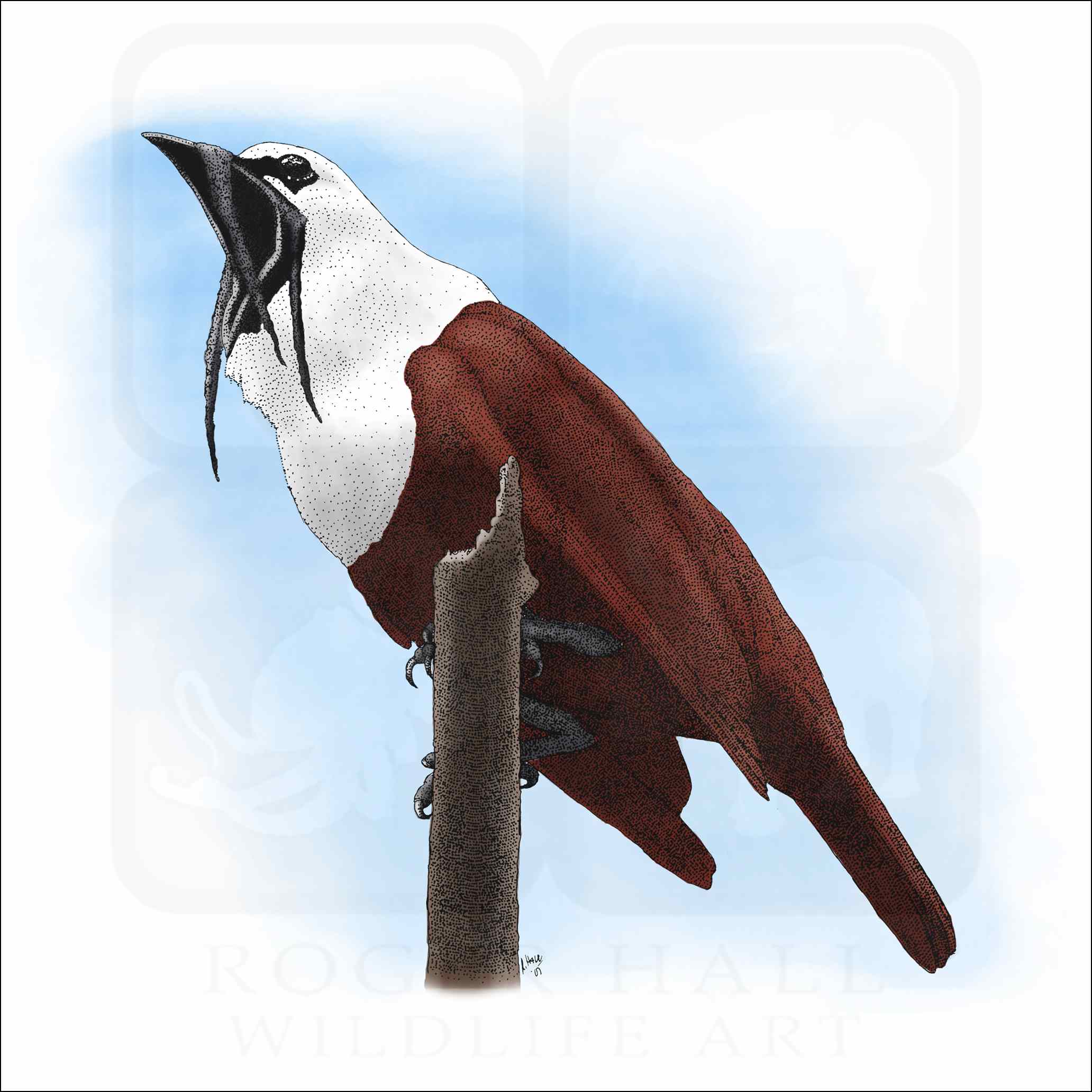 Fine art illustration of a Three-Wattled bellbird (Procnias tricarunculatus.) The illustration is available in black and white or color.