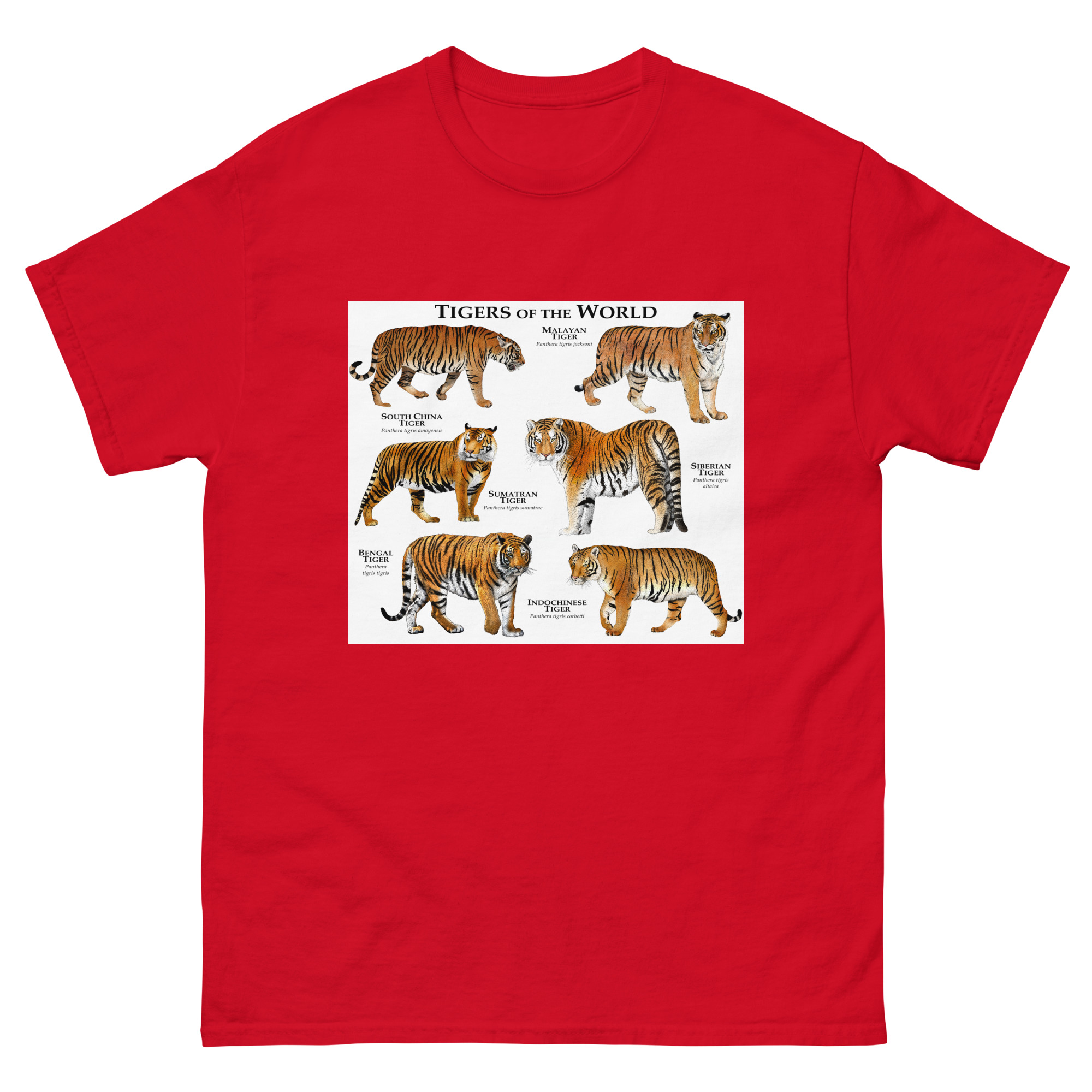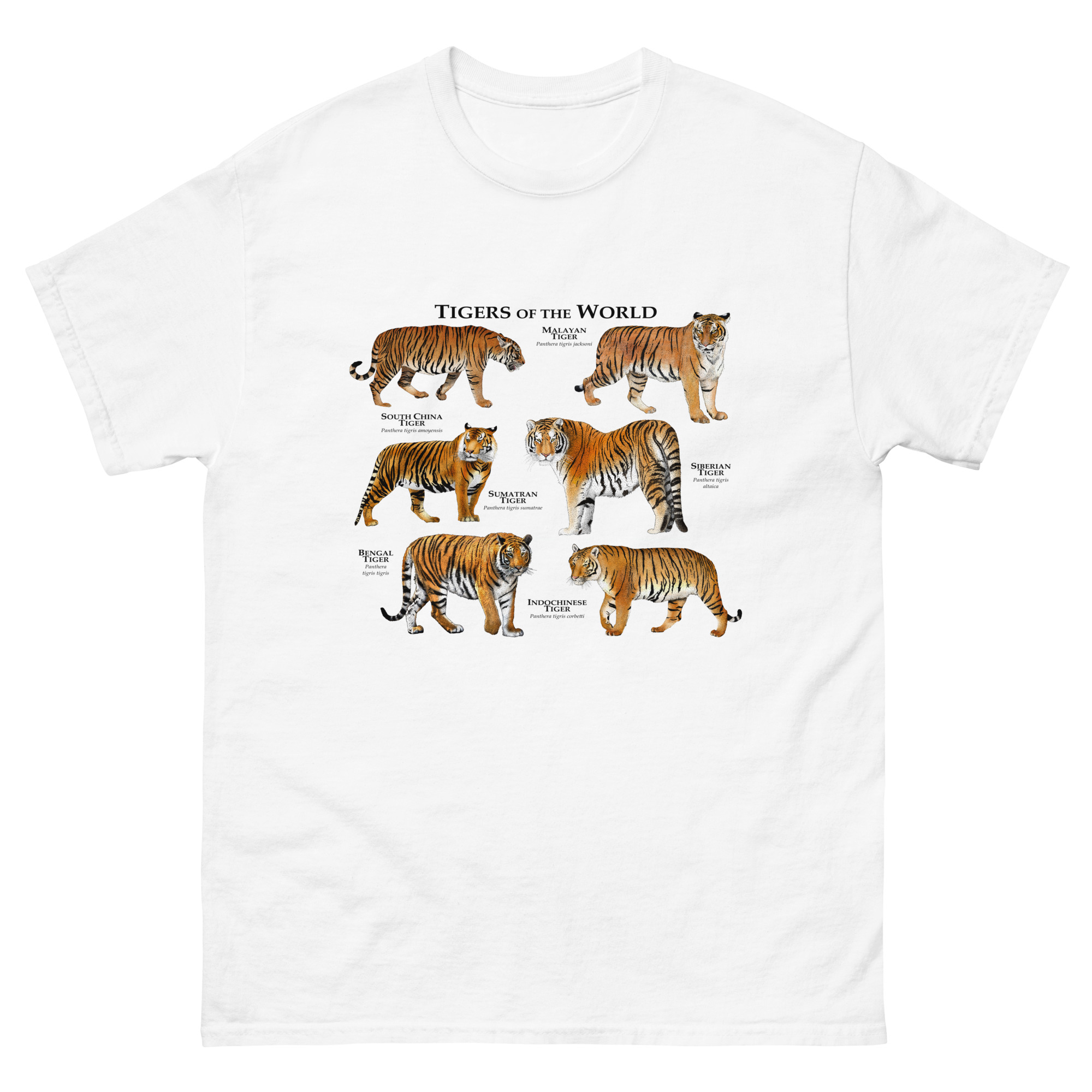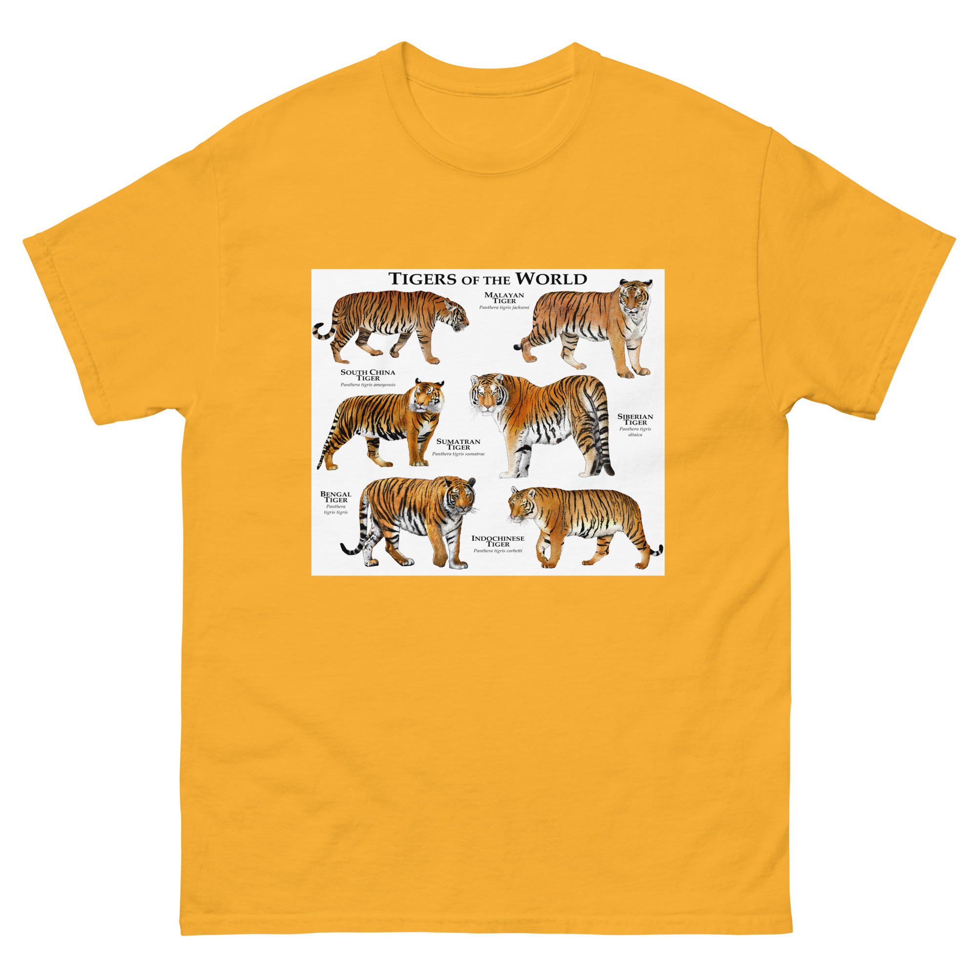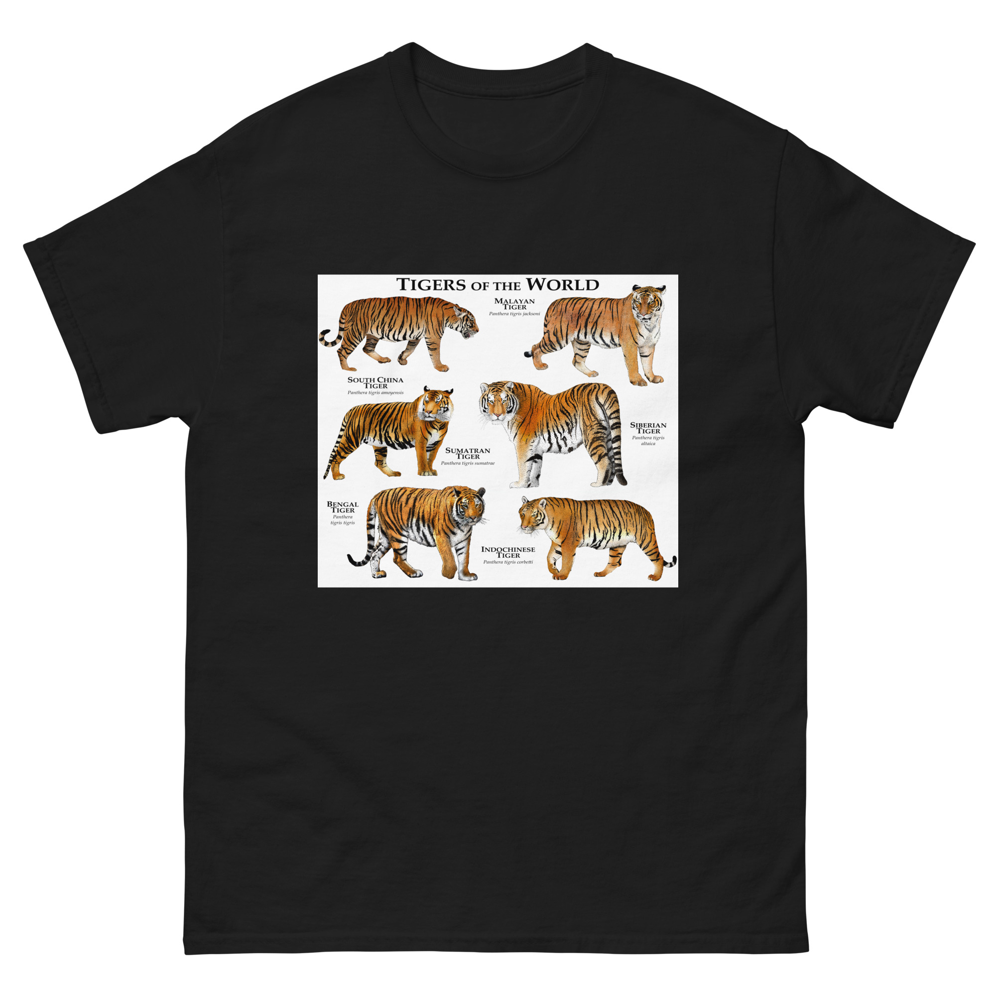There are six subspecies Panthera tigris. (At one time there were eight, but two have gone extinct.) While they are highly protected in nearly all of their remaining habitats, they remain some of the most endangered animals on earth. This image features fine art illustrations of all extant species of tiger printed on a high quality men’s cotton t-shirt