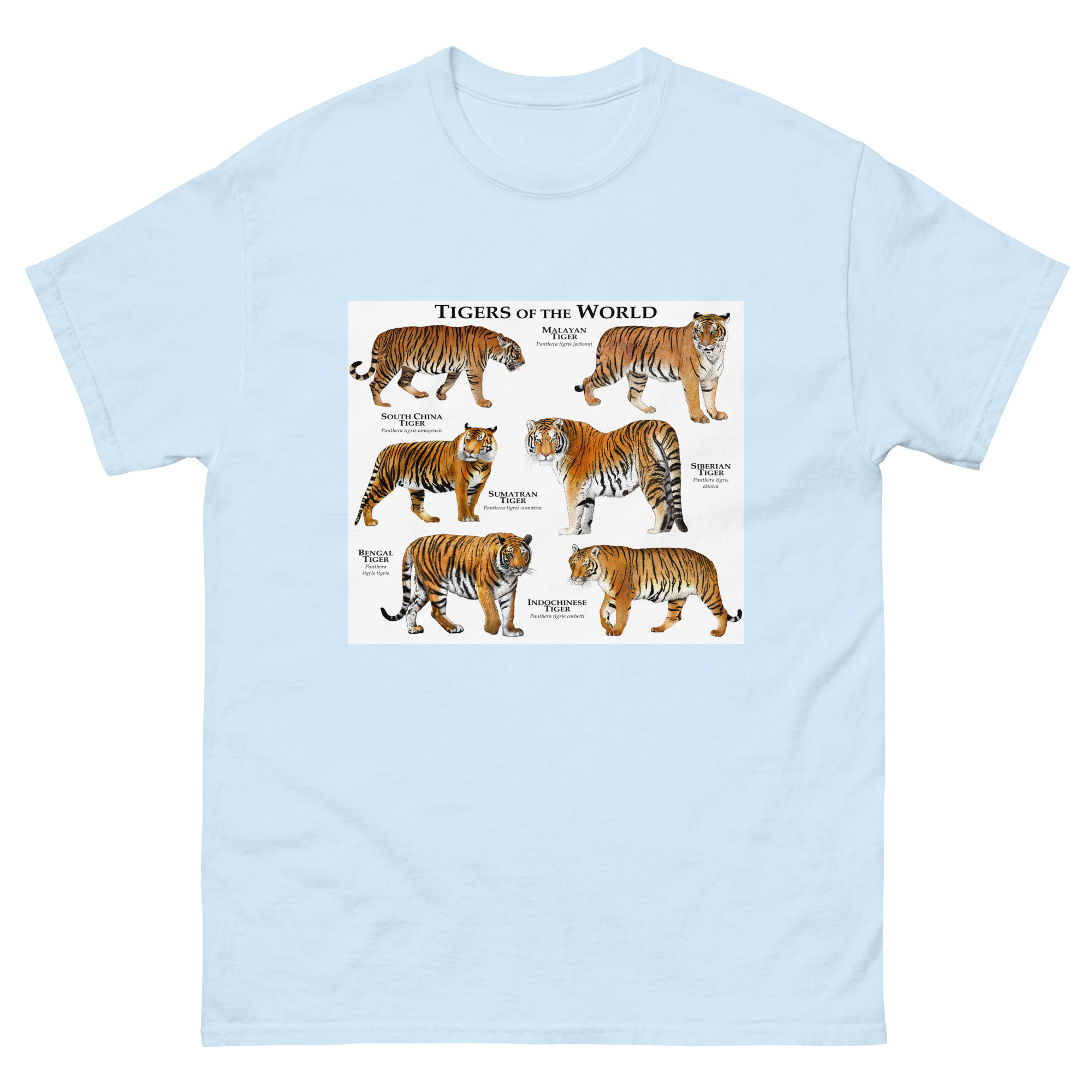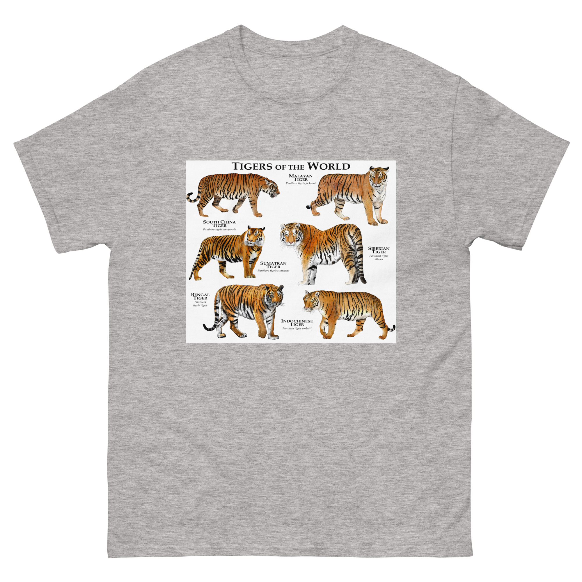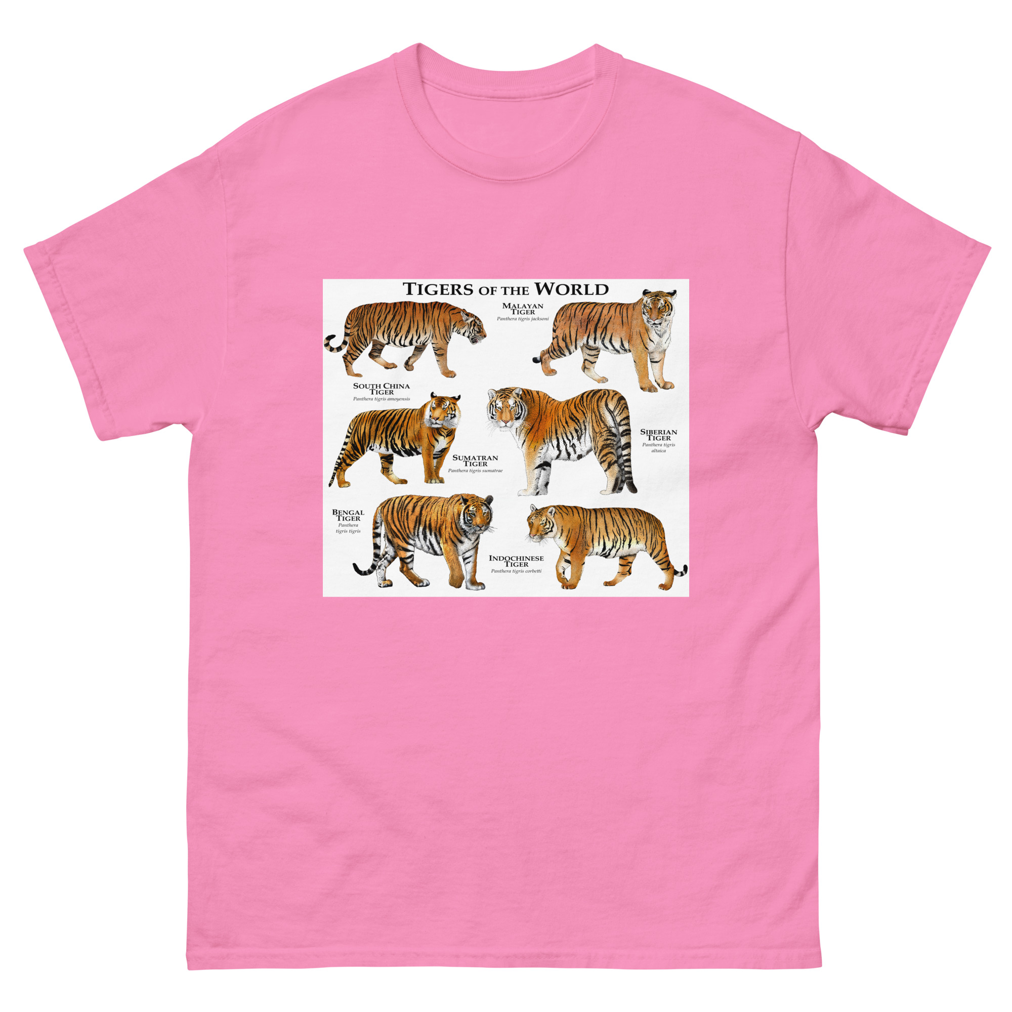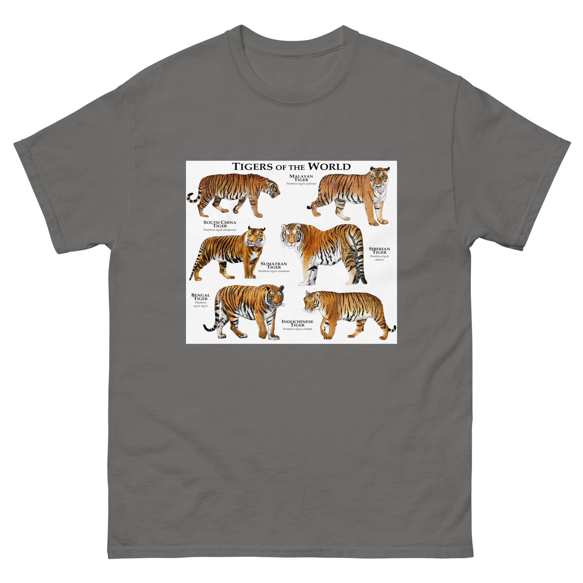 There are six subspecies Panthera tigris. (At one time there were eight, but two have gone extinct.) While they are highly protected in nearly all of their remaining habitats, they remain some of the most endangered animals on earth. This image features fine art illustrations of all extant species of tiger printed on a high quality men’s cotton t-shirt