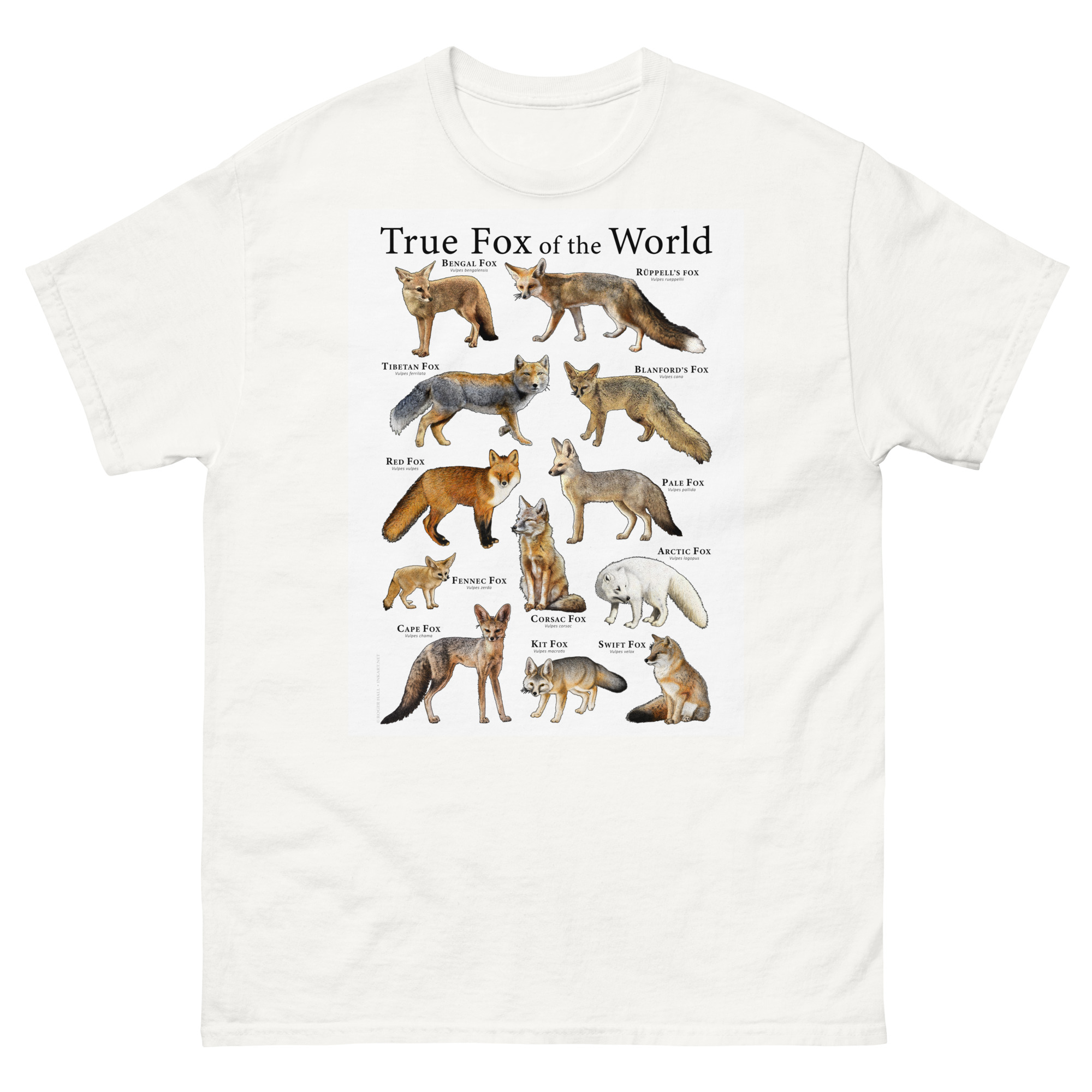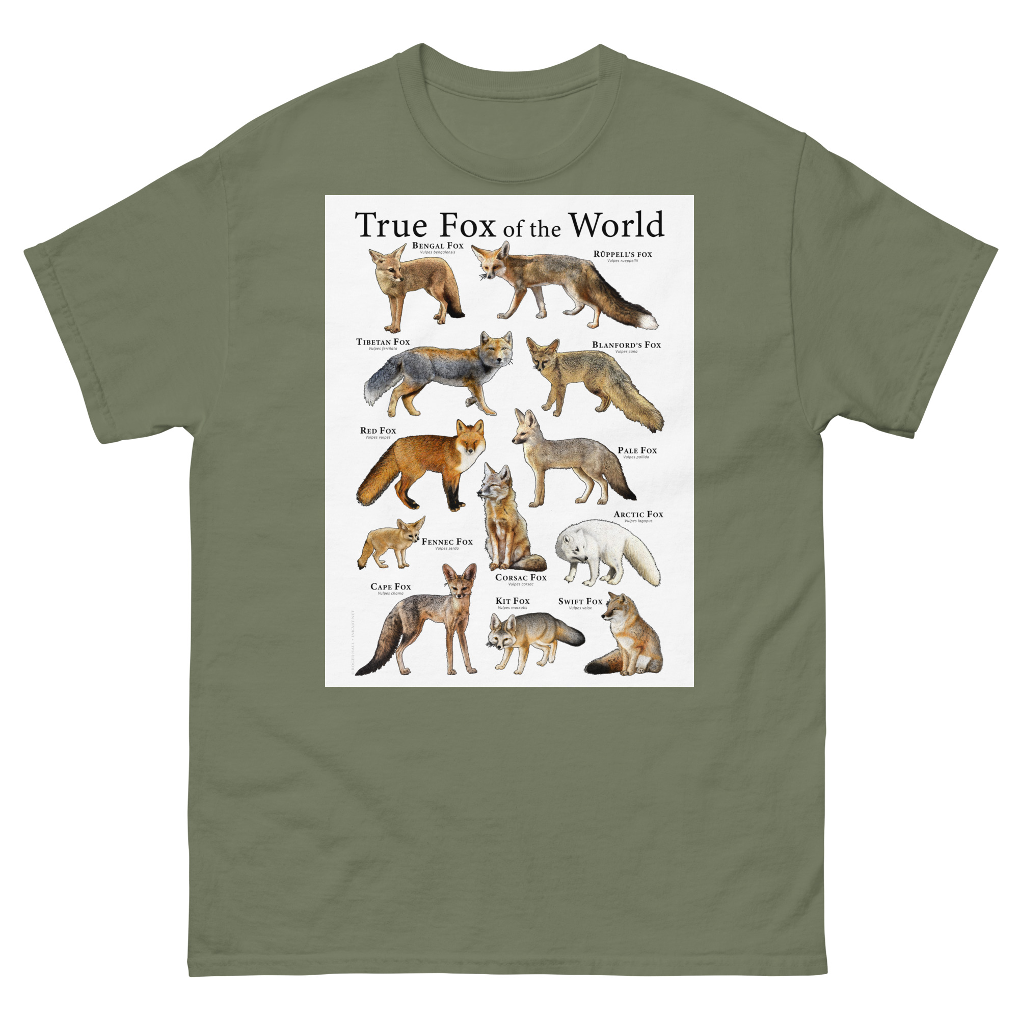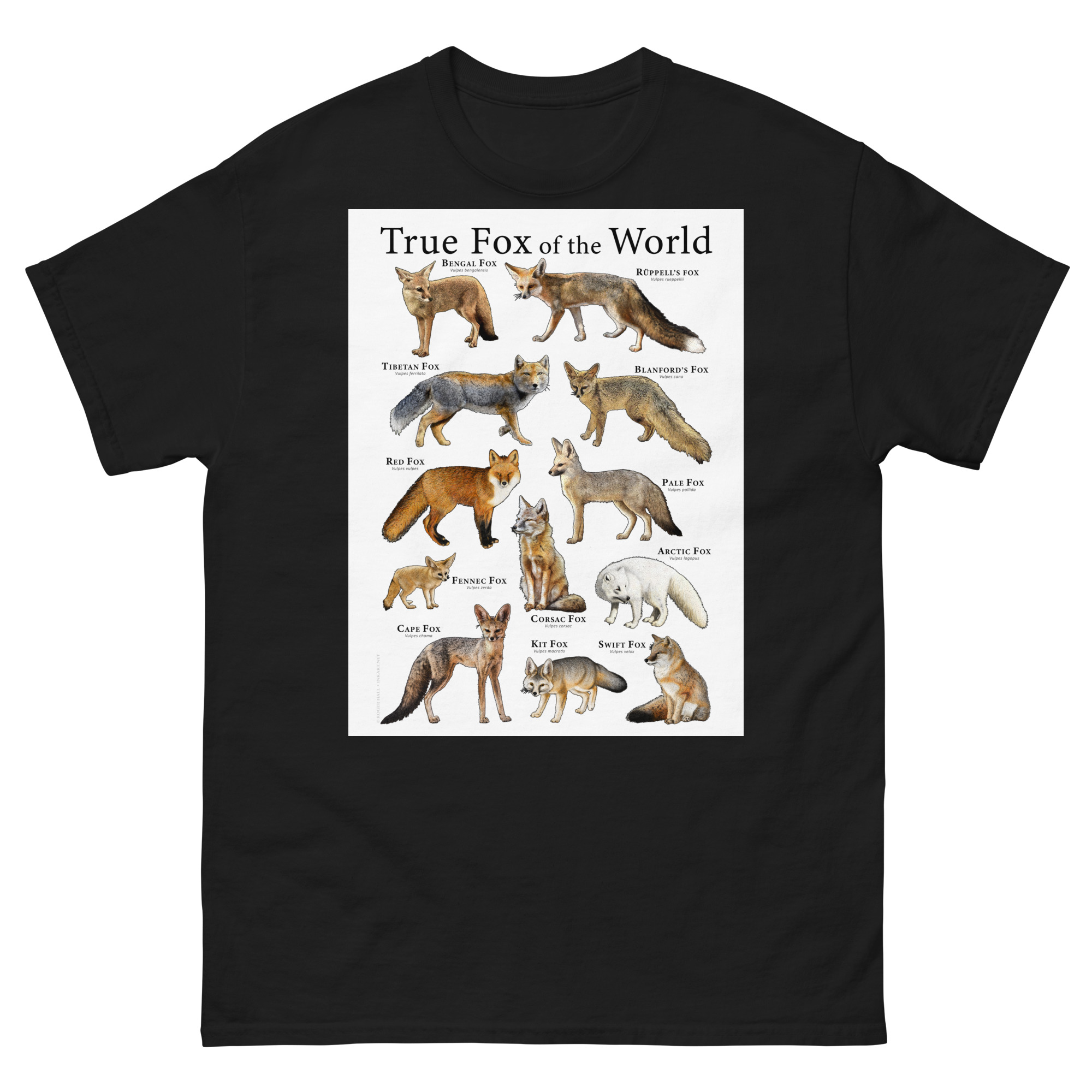 There are twelve species the genus Vulpes or “True Foxes.” Which means they form a proper clade. They’re found in various environments in Africa, North America and Asia. This poster includes fine art illustrations of all living species of true foxes (Vulpes) printed on a high-quality 100% men’s cotton t-shirt.