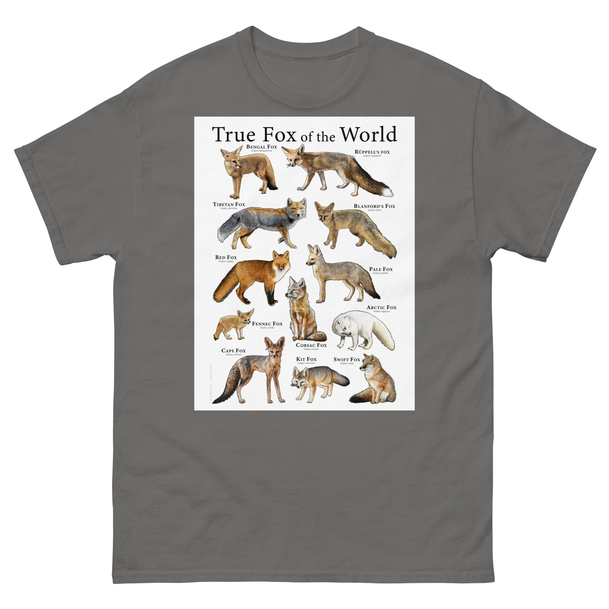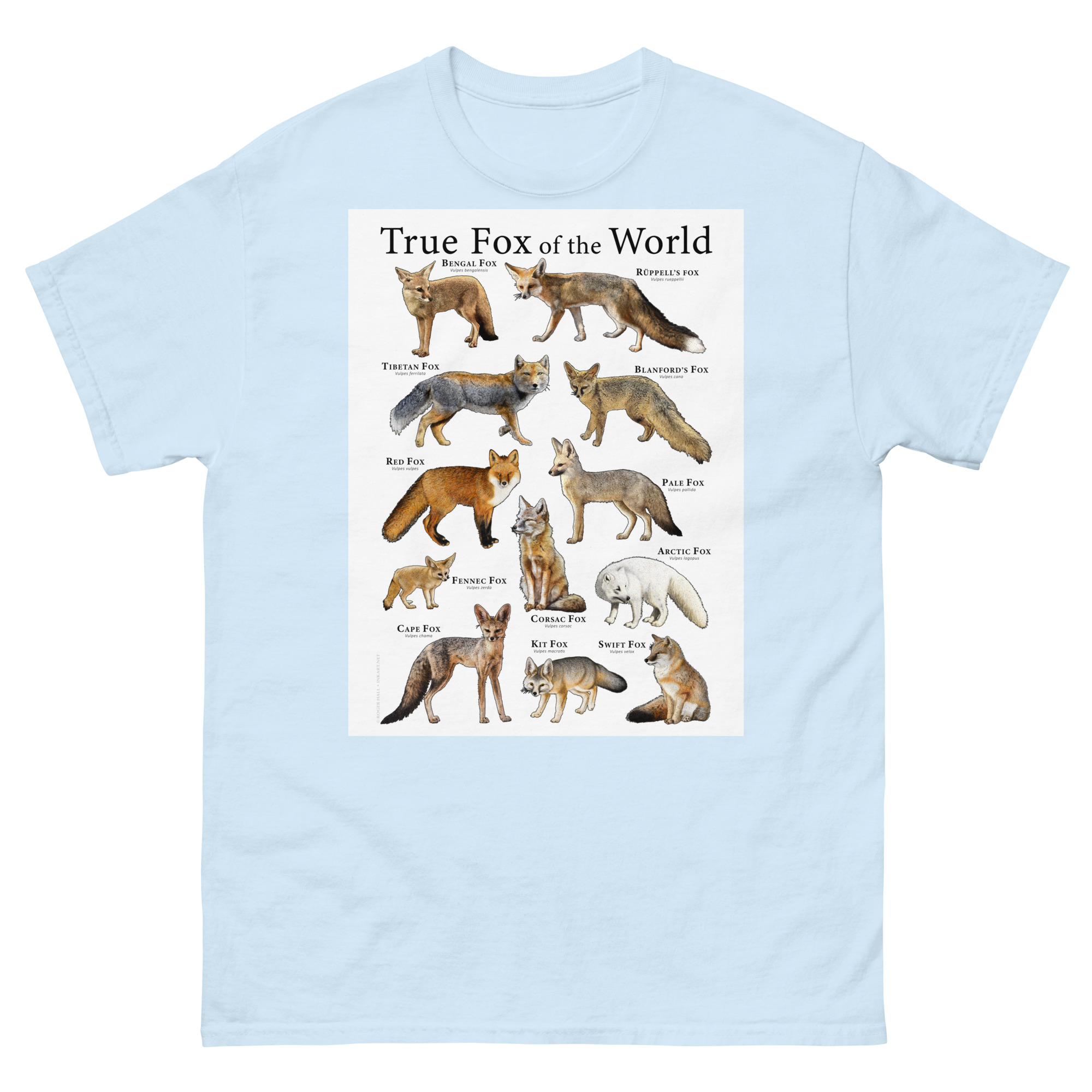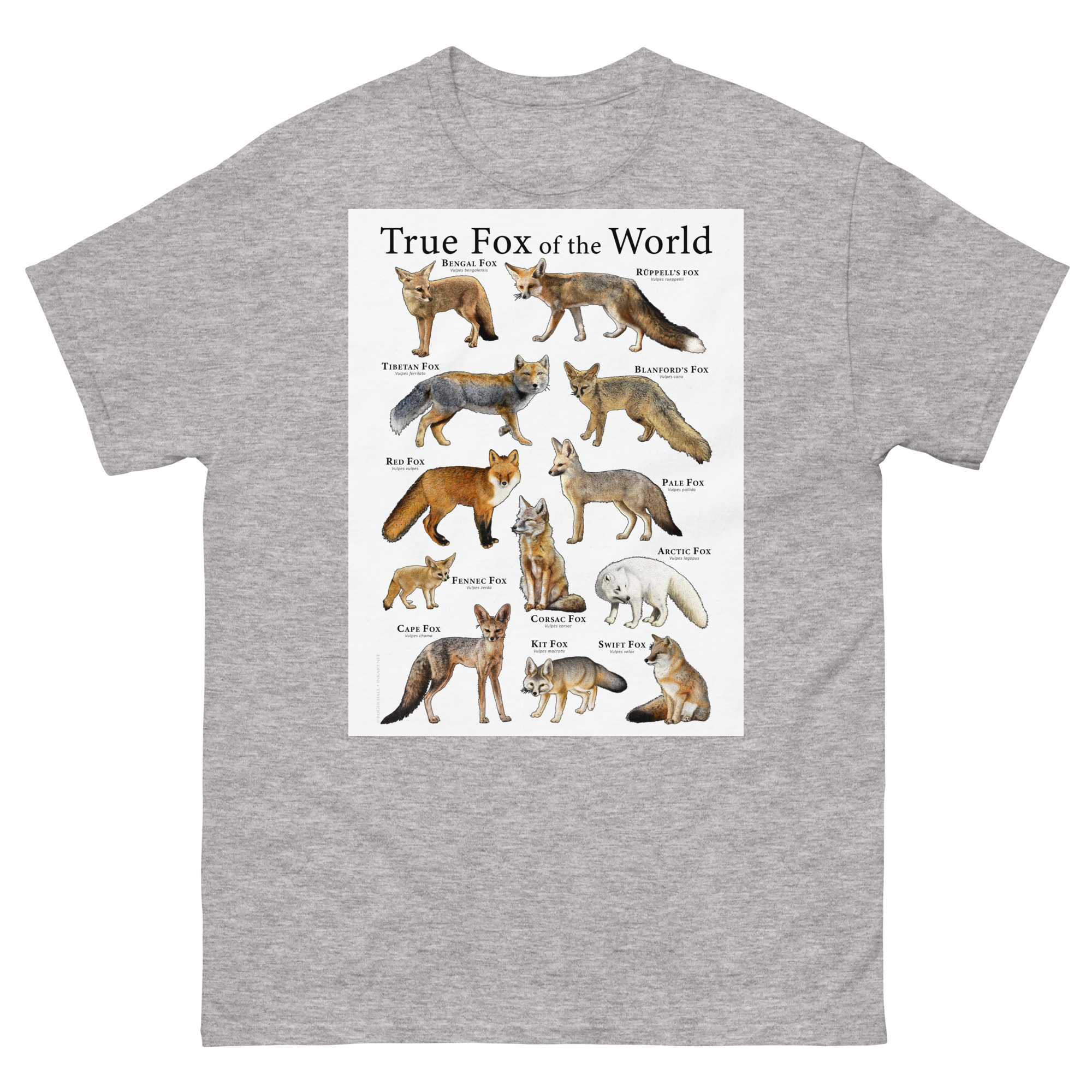 There are twelve species the genus Vulpes or “True Foxes.” Which means they form a proper clade. They’re found in various environments in Africa, North America and Asia. This poster includes fine art illustrations of all living species of true foxes (Vulpes) printed on a high-quality 100% men’s cotton t-shirt.