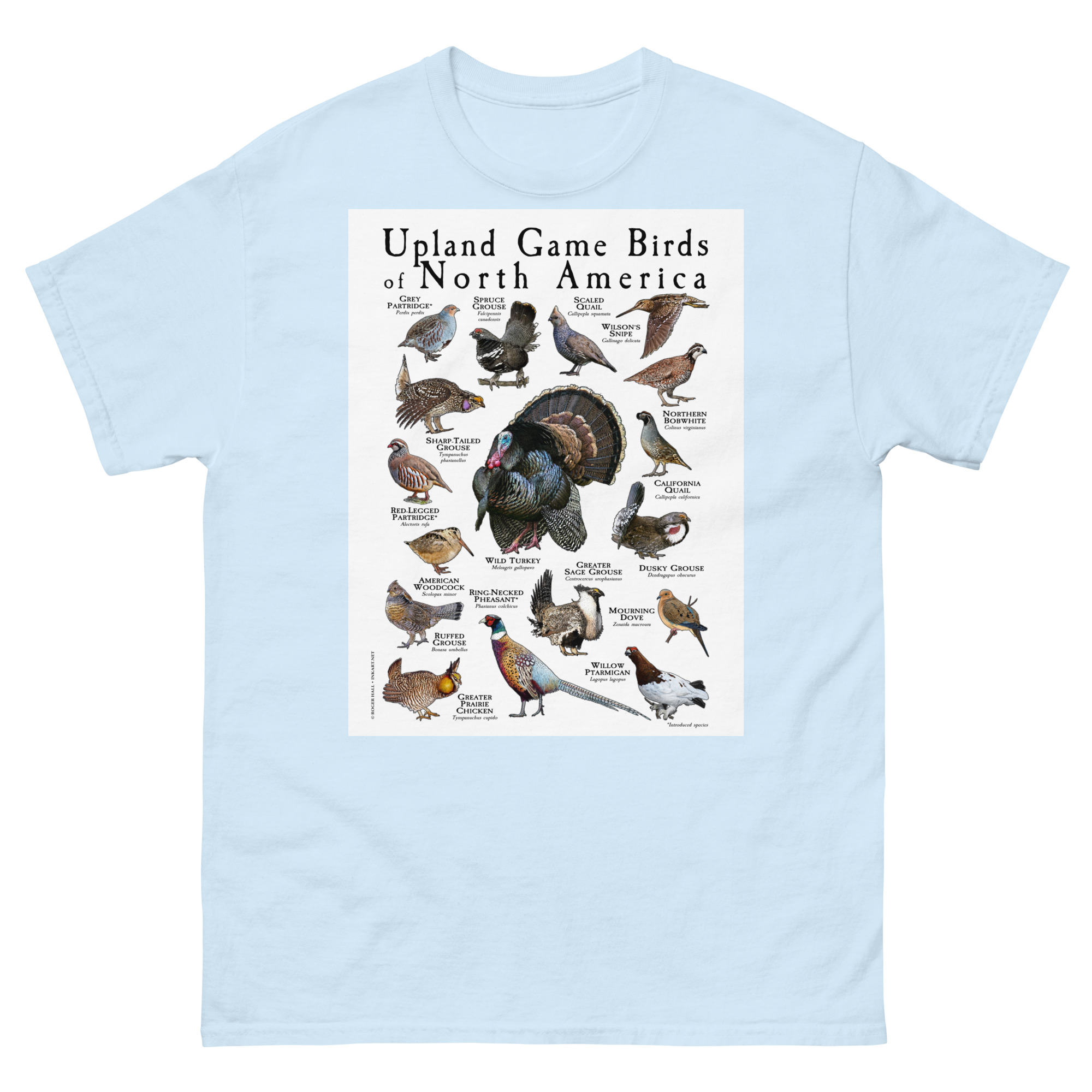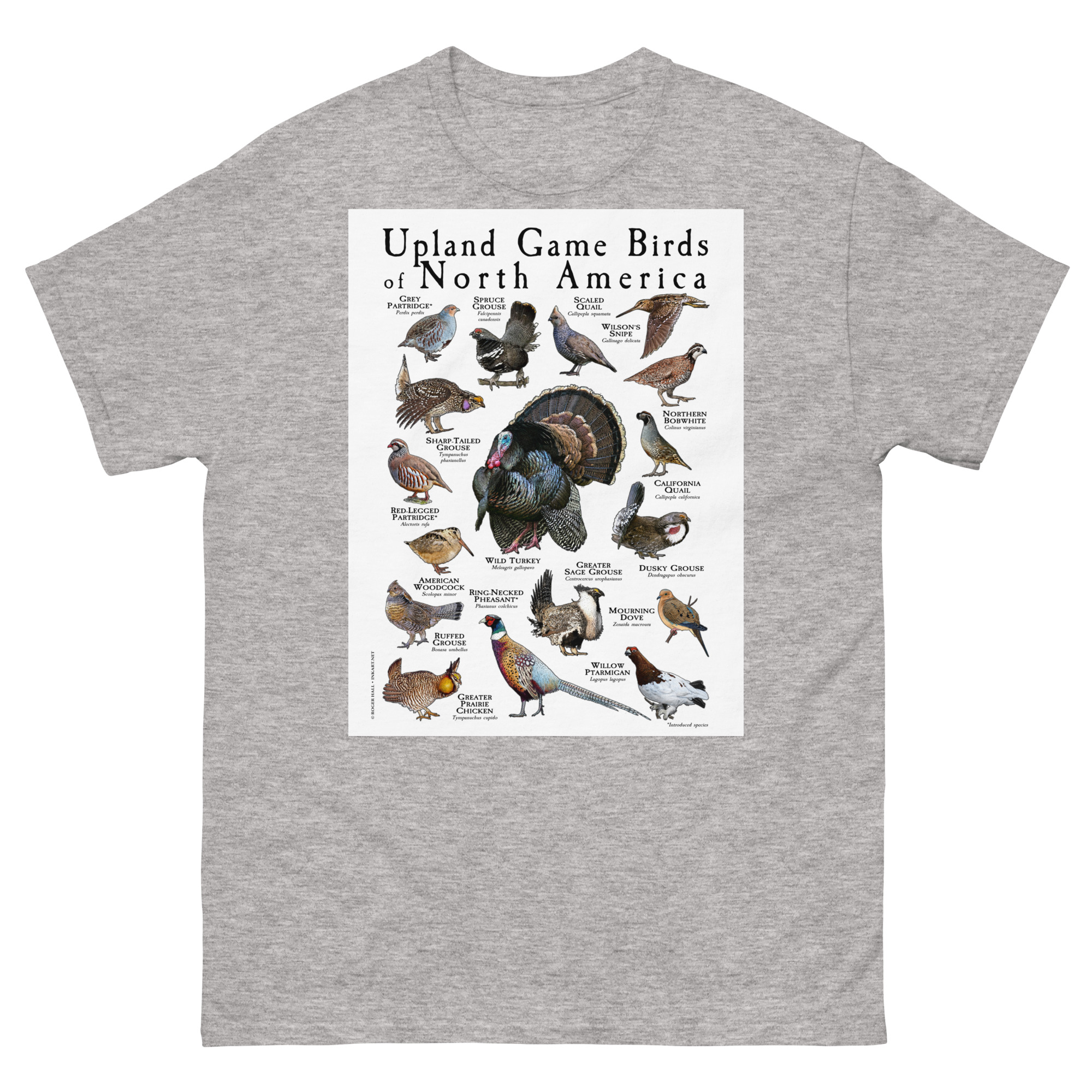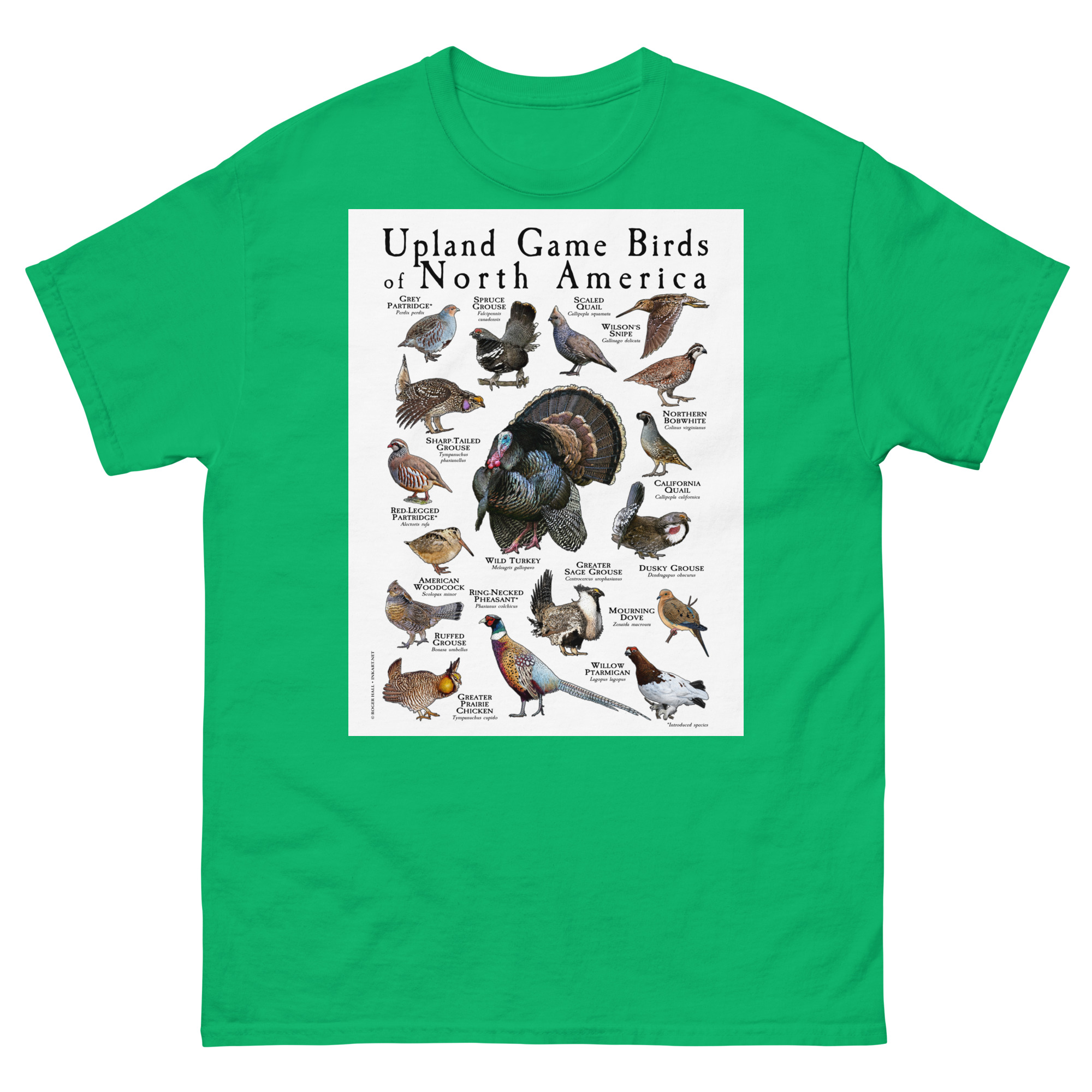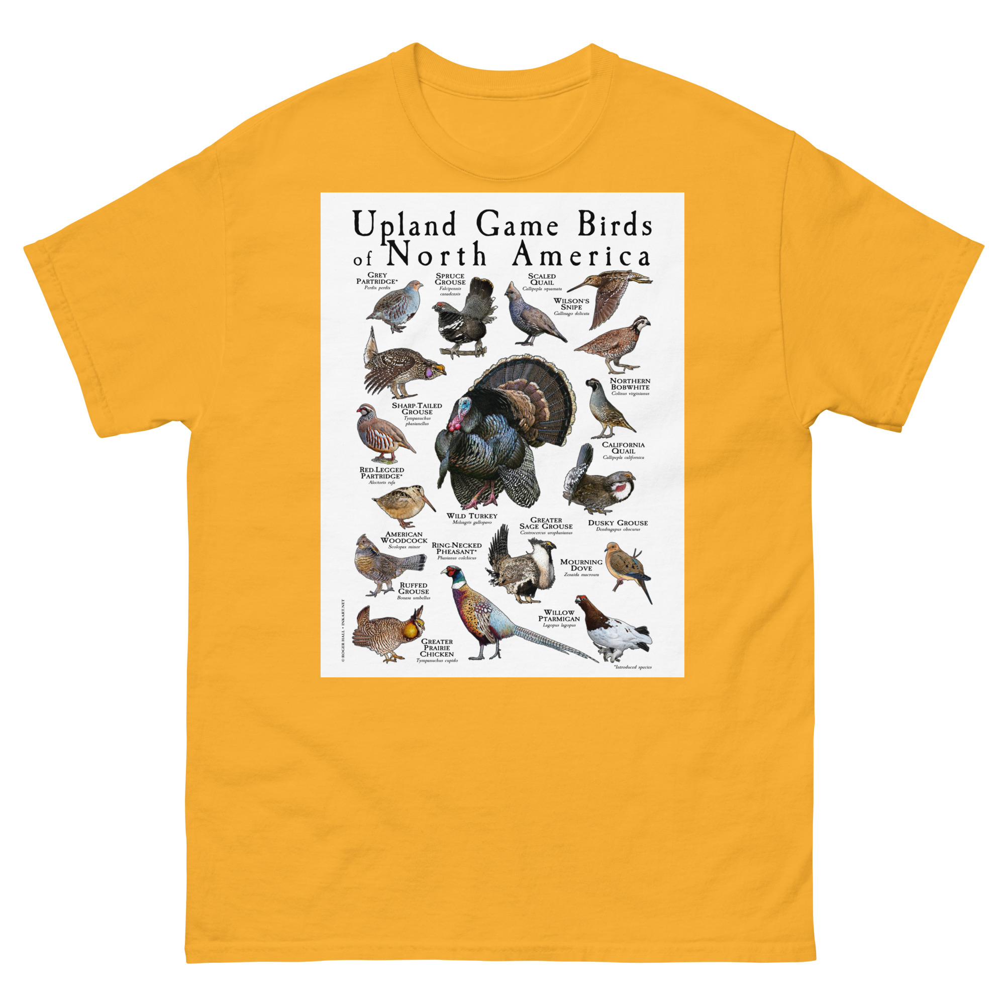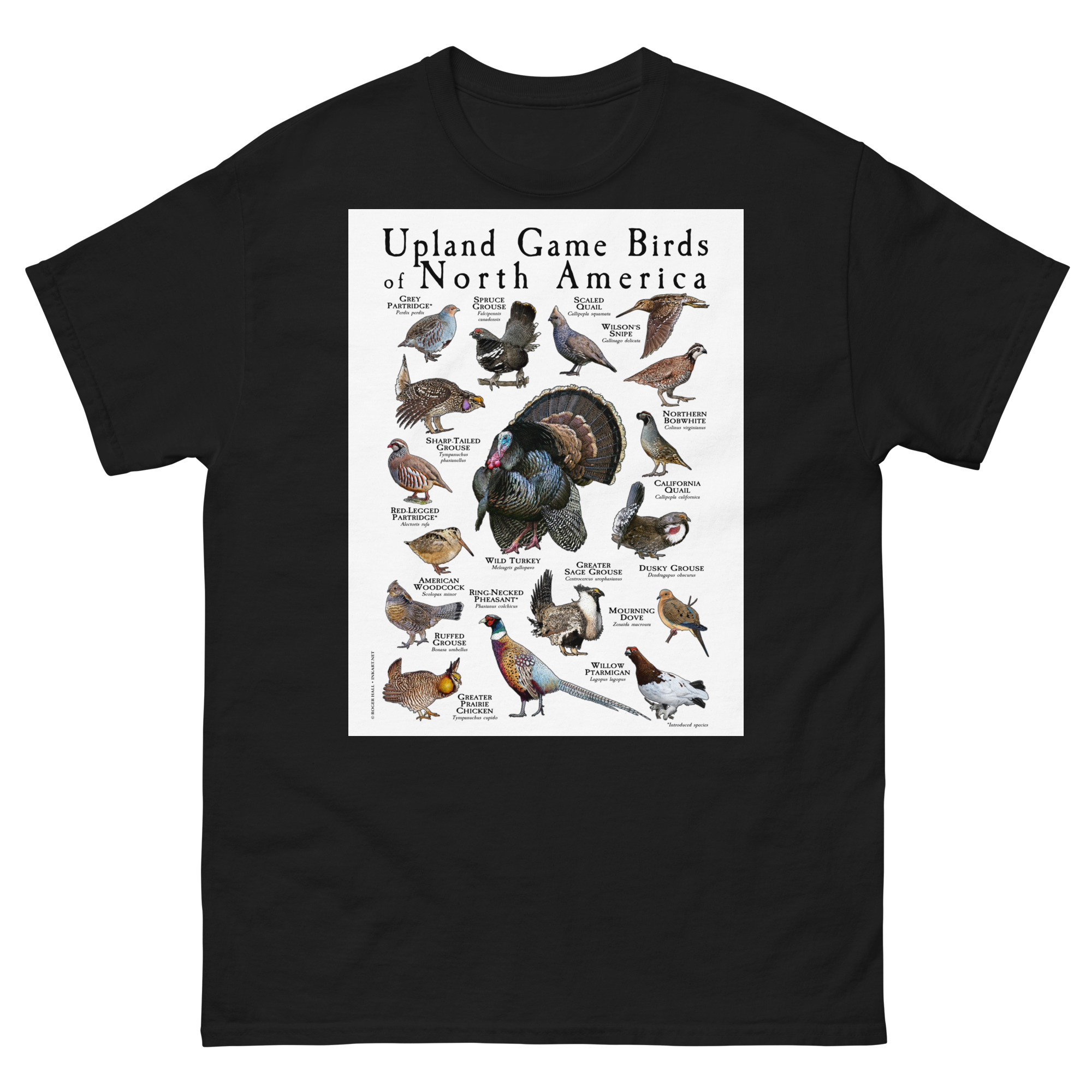 A colorful collage of scientifically accurate illustration of various species of upland game birds of North America. The layout features seventeen different types of game birds, including some of North America’s most prized species printed on a high-quality 100% men’s cotton t-shirt.