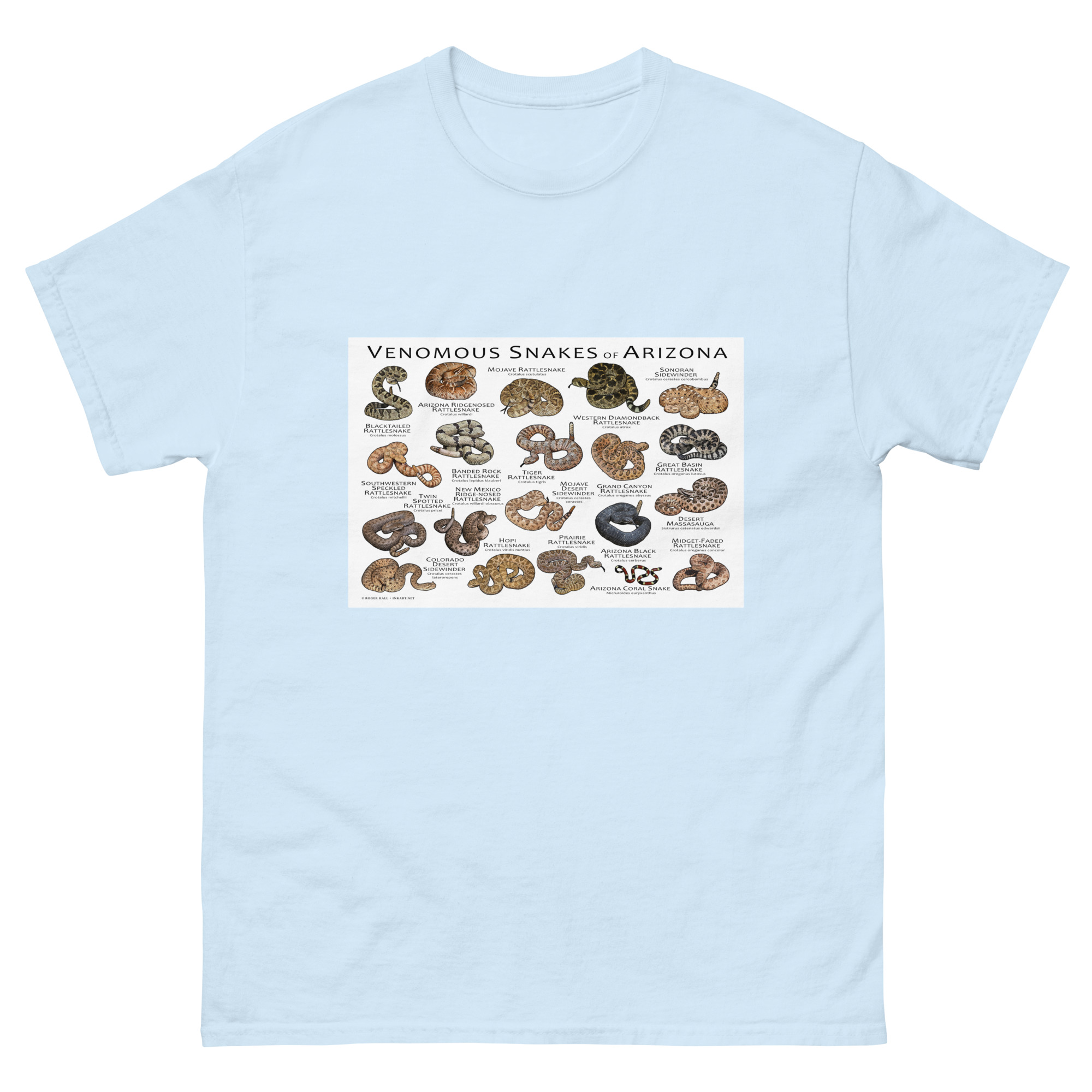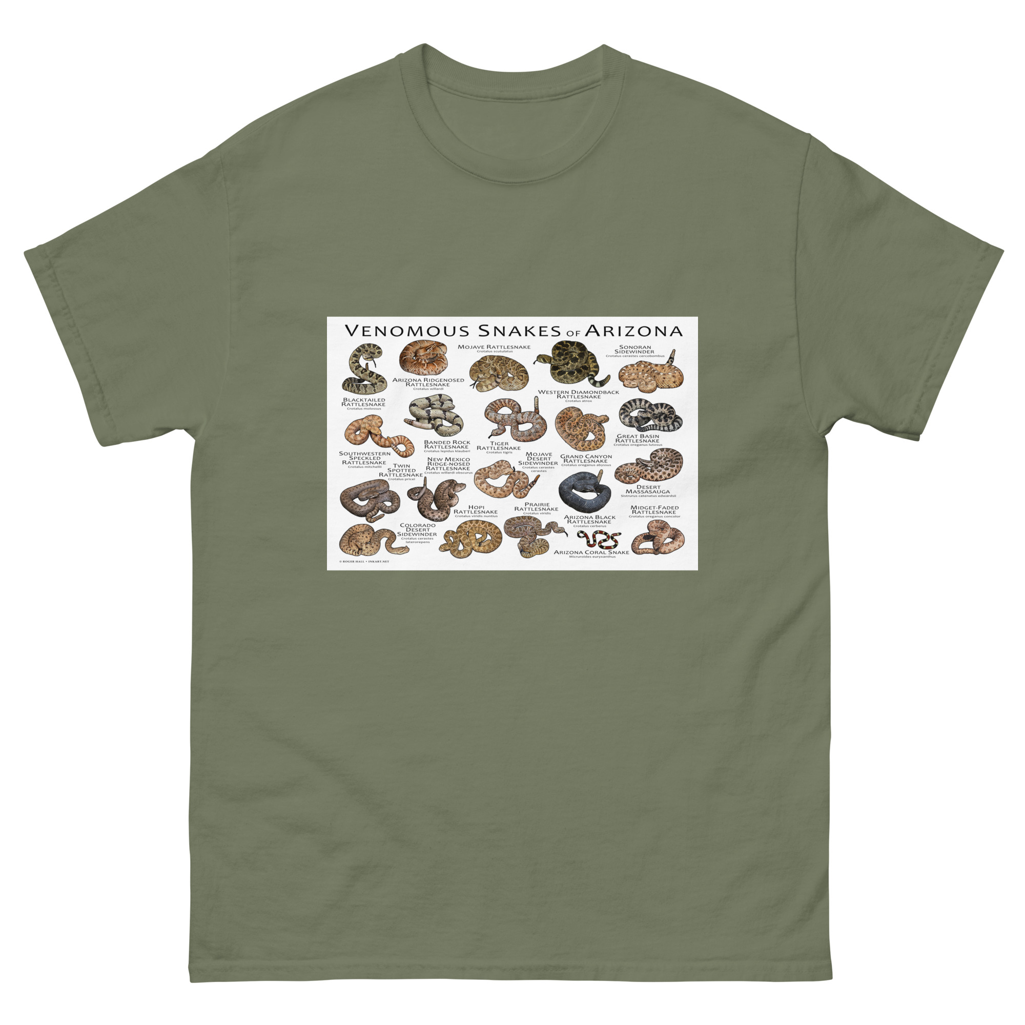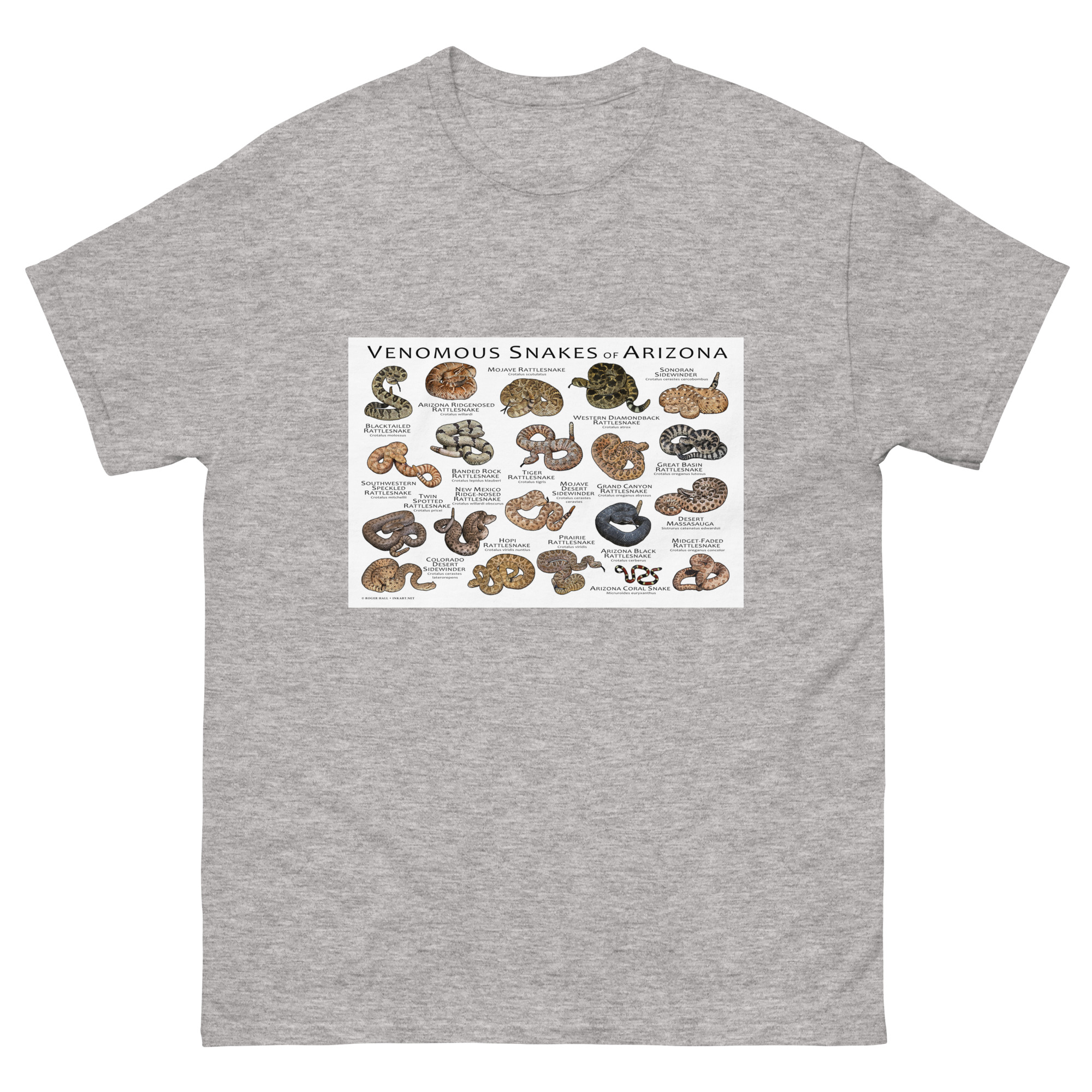 There are twenty species of venomous snakes found in the state of Arizona in the US. While these snakes might have fearsome reputations, on average only few people in die each year in the United States from snake bites. This artwork features fine art illustrations of the all venomous snake species native to Arizona printed in a high-quality men’s cotton t-shirt.