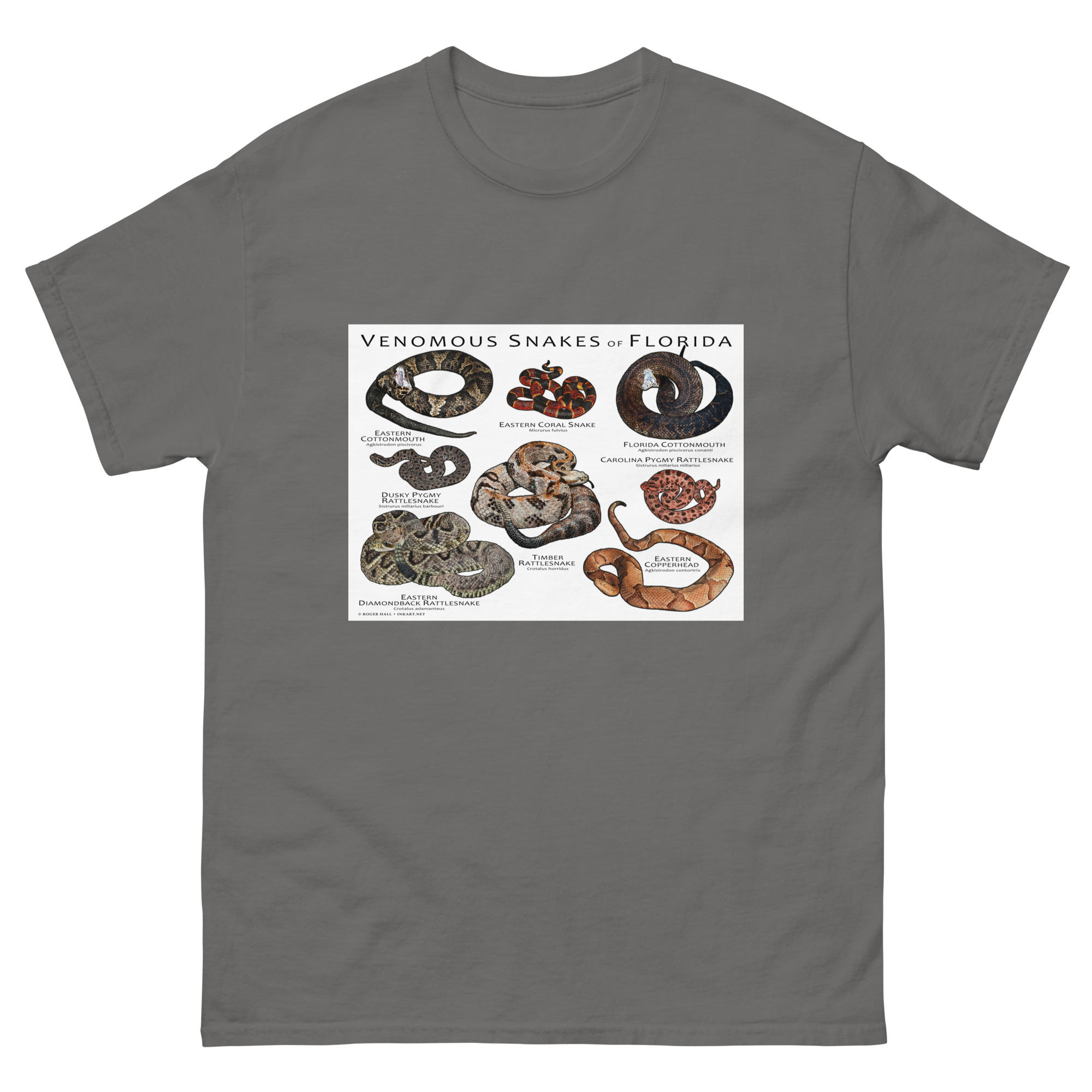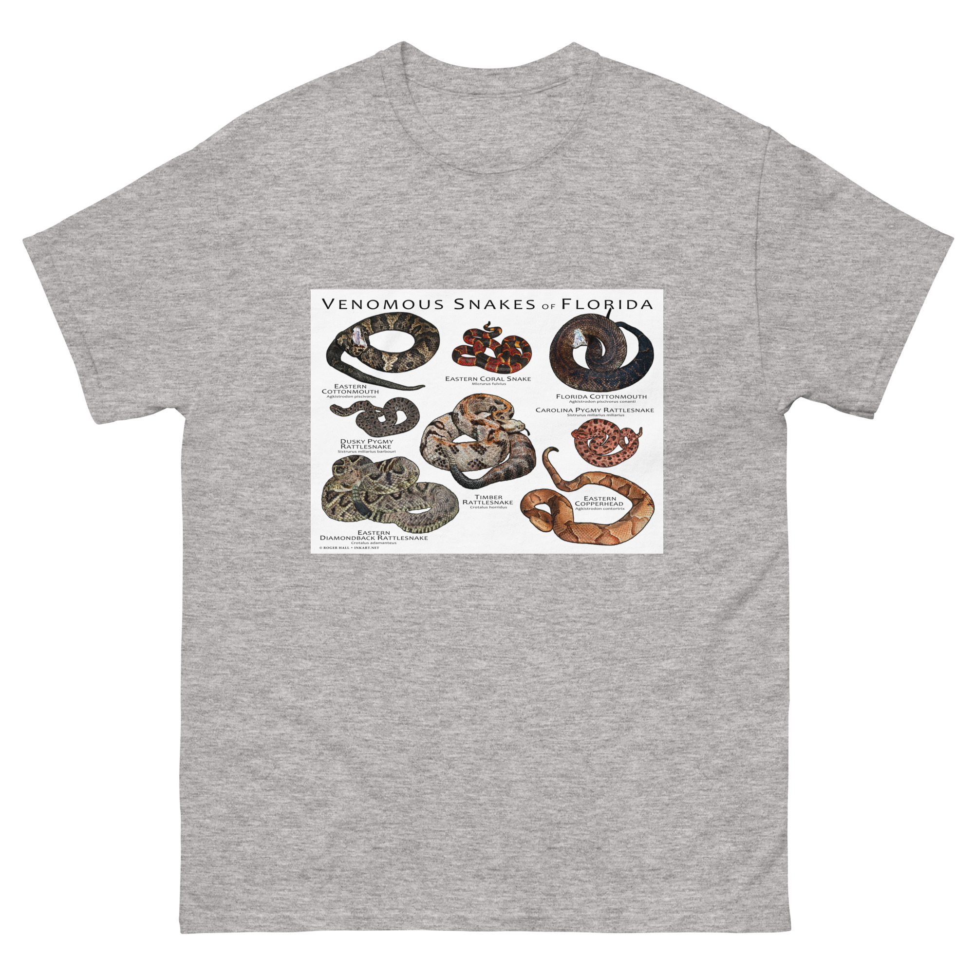 There are eight species of venomous snakes found in the state of Florida in the US. While these snakes might have fearsome reputations, on average only few people in die each year in the United States from snake bites. This artwork features fine art illustrations of the all venomous snake species native to Florida printed in a high-quality men’s cotton t-shirt.