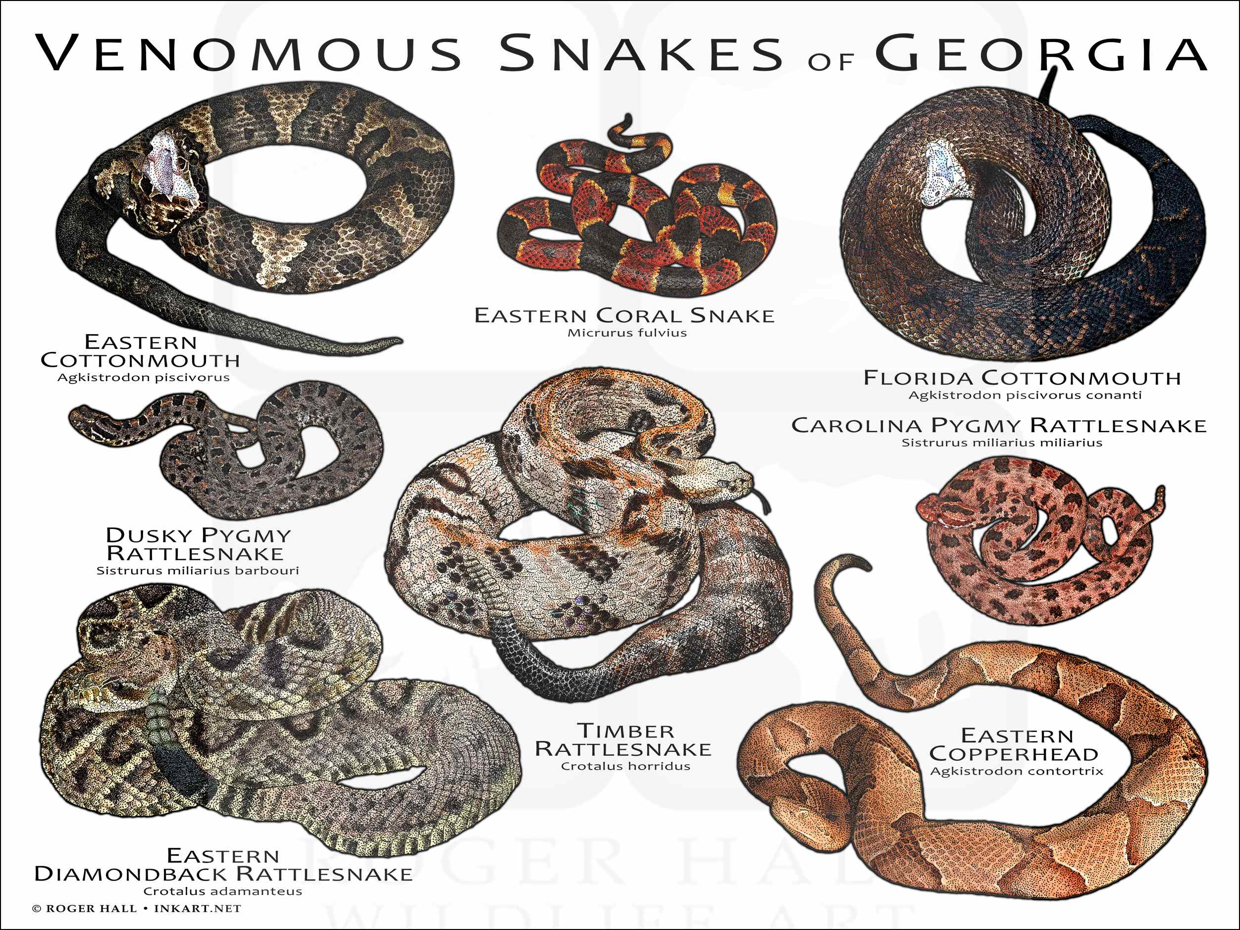 There are eight species of venomous snakes found in the state of Georgia in the US. While these snakes might have fearsome reputations, on average only few people in die each year in the United States from snake bites. This poster features fine art illustrations of the all venomous snake species native to Georgia