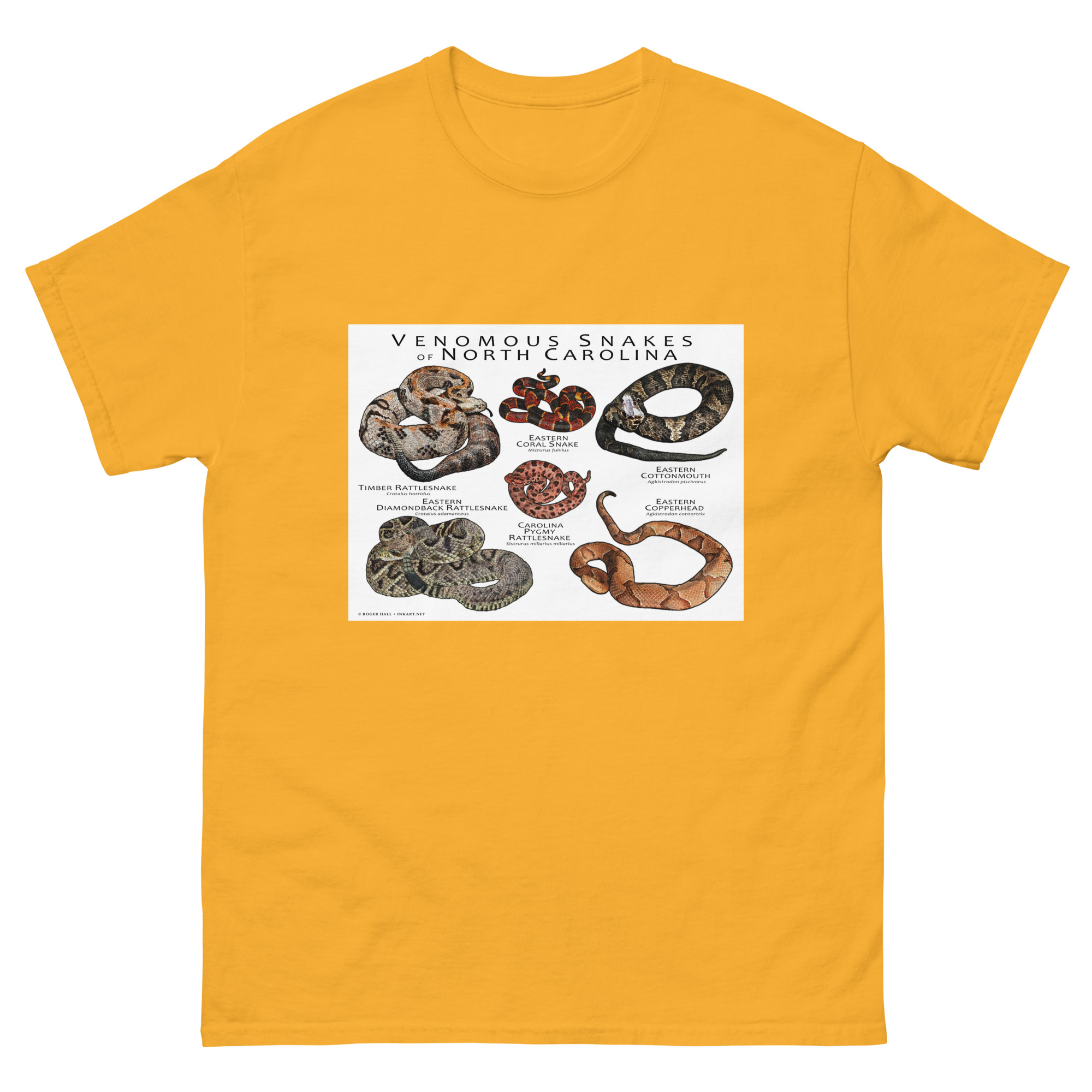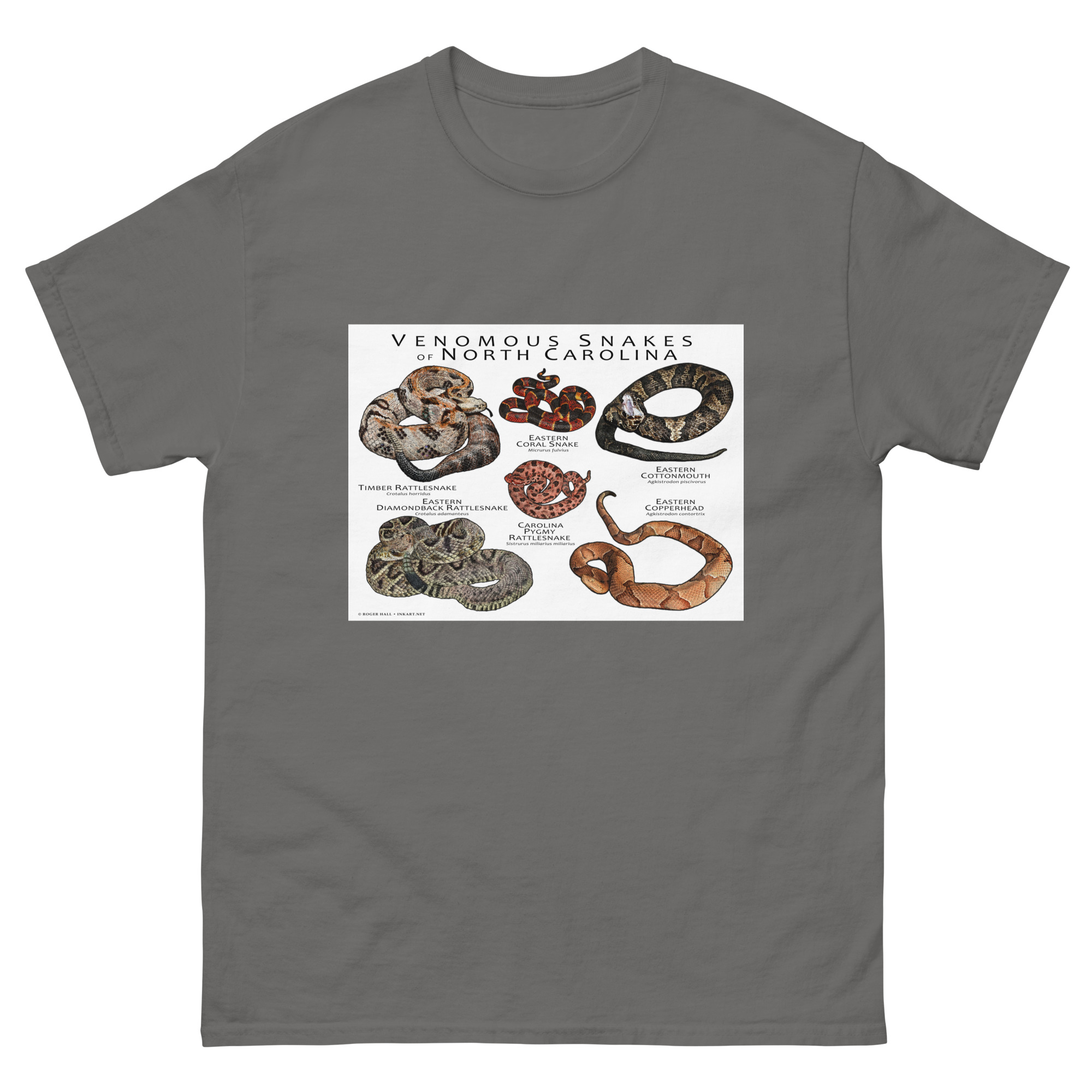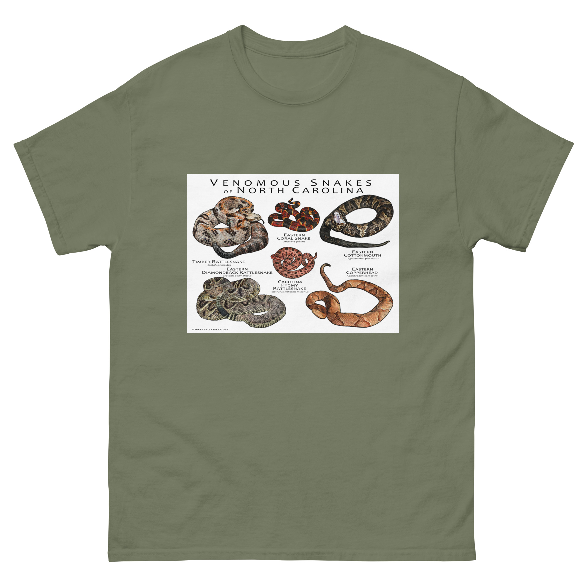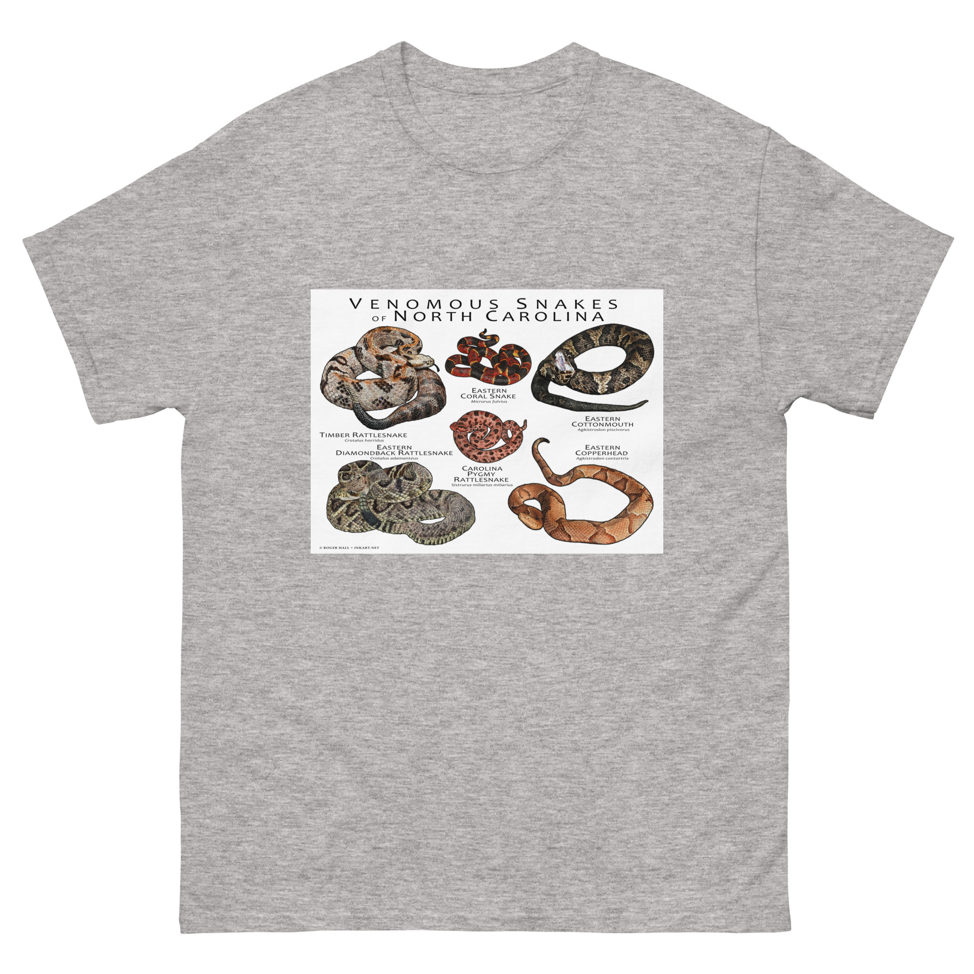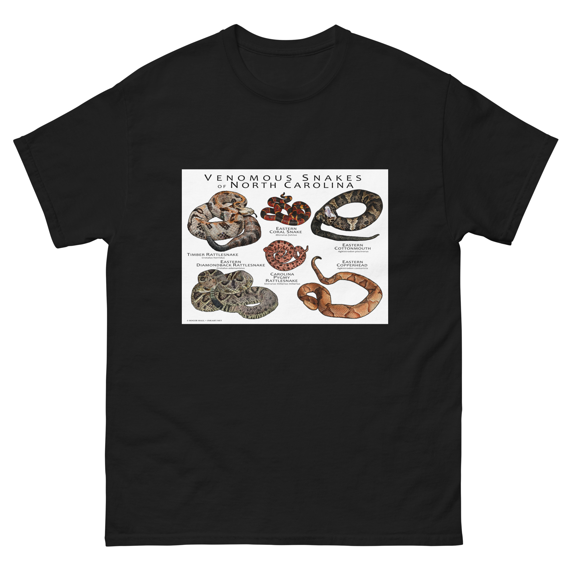 There are six species of venomous snakes found in the state of North Carolina in the US. While these snakes might have fearsome reputations, on average only few people in die each year in the United States from snake bites. This artwork features fine art illustrations of the all venomous snake species native to North Carolina printed in a high-quality men’s cotton t-shirt.