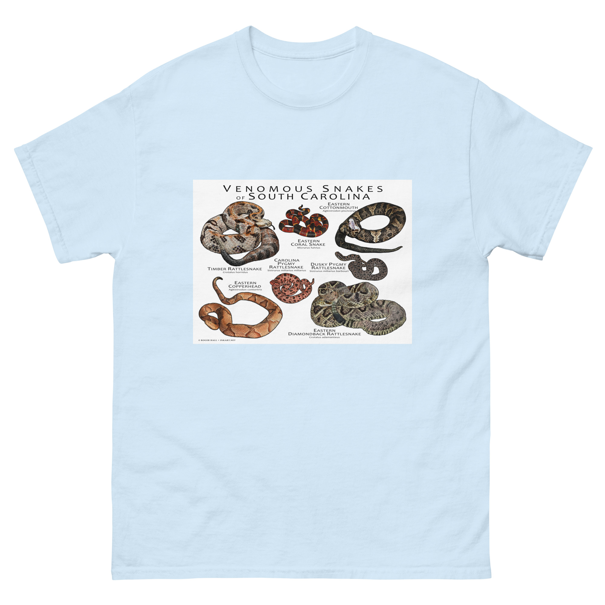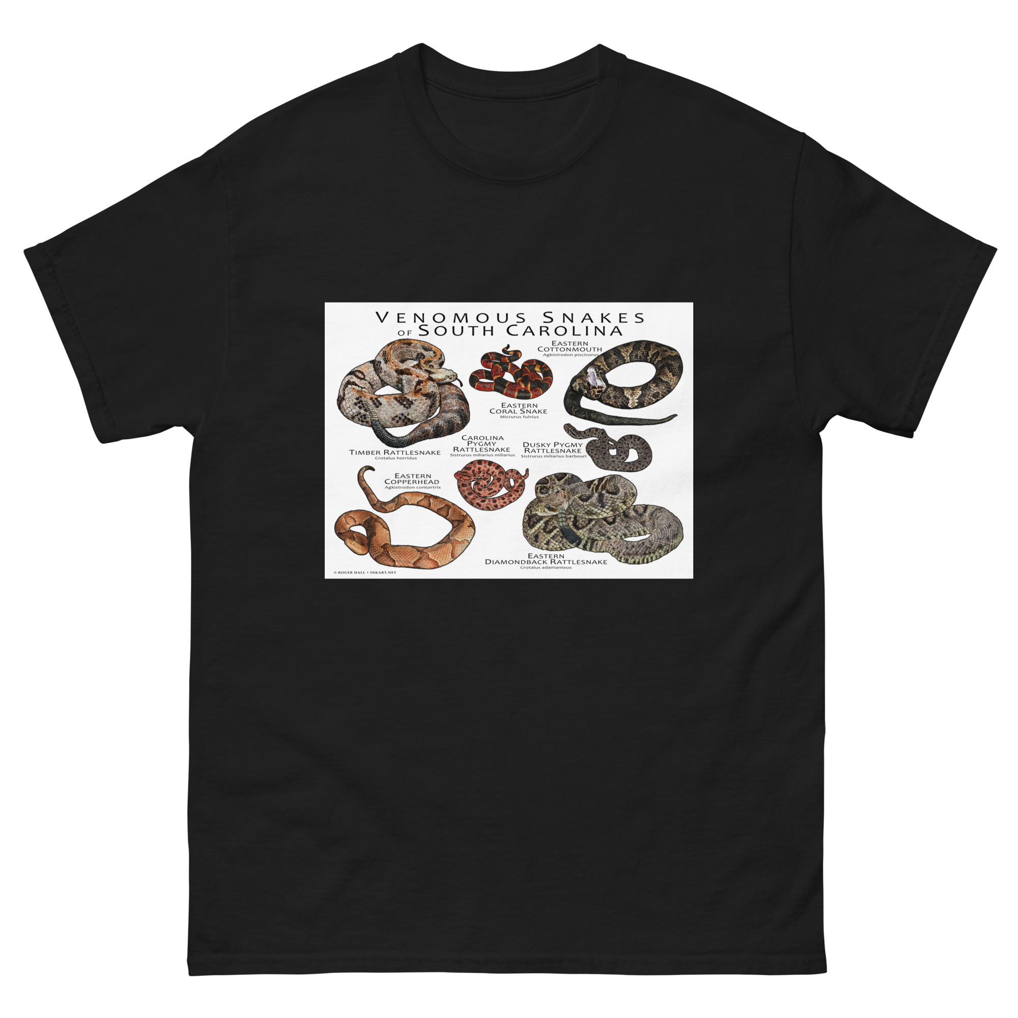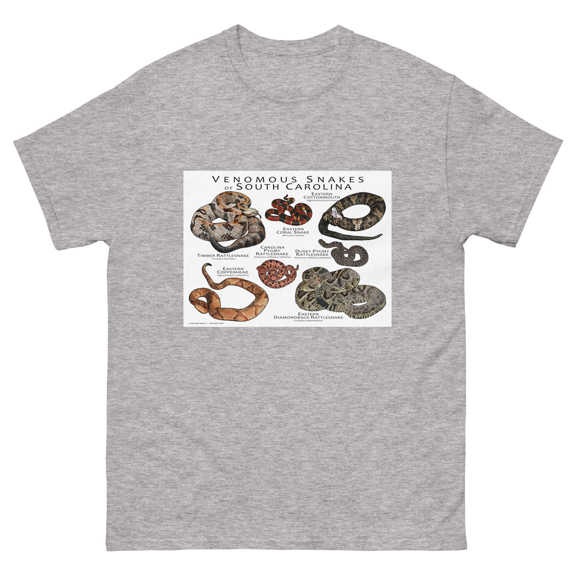 There are seven species of venomous snakes found in the state of South Carolina in the US. While these snakes might have fearsome reputations, on average only few people in die each year in the United States from snake bites. This artwork features fine art illustrations of the all venomous snake species native to South Carolina printed in a high-quality men’s cotton t-shirt.