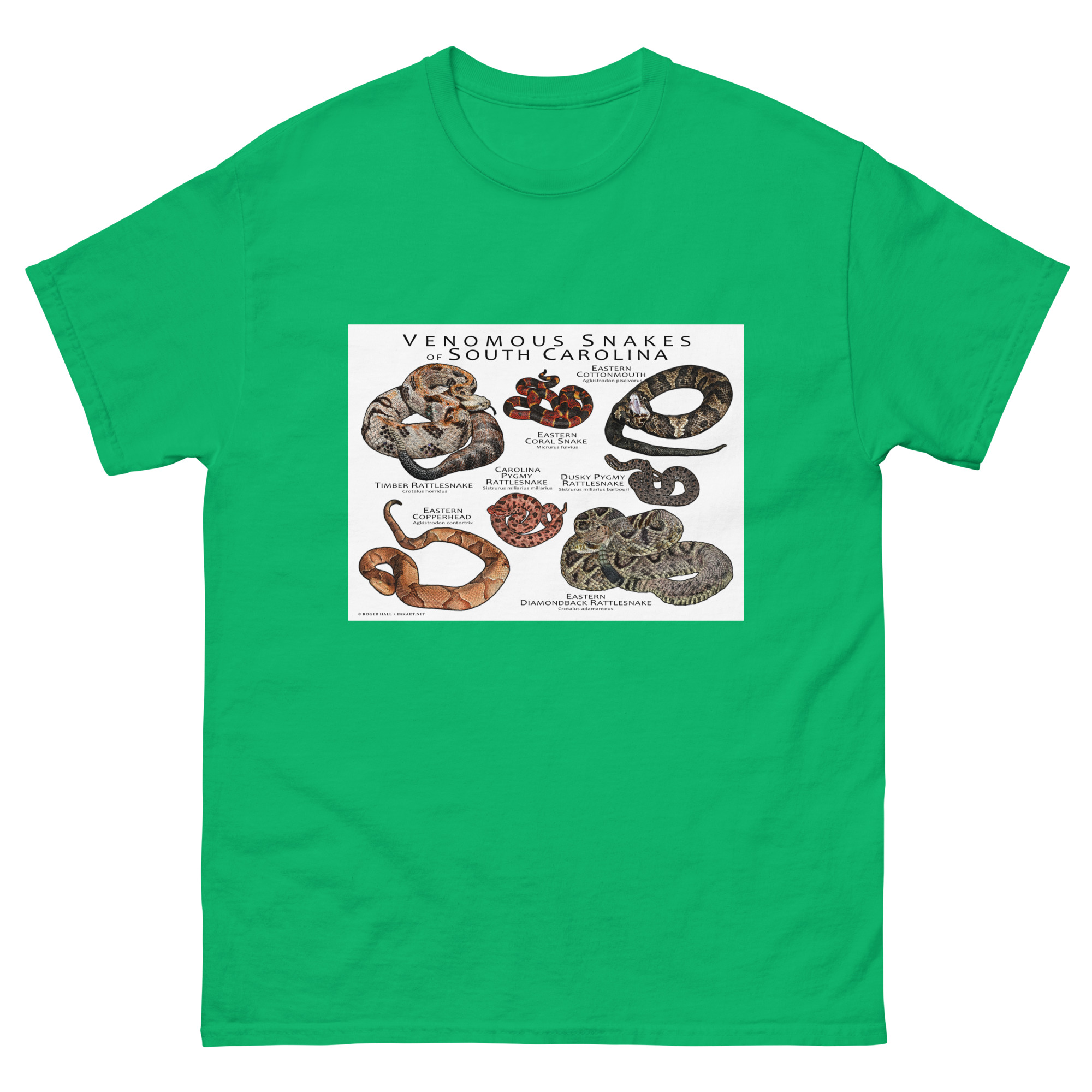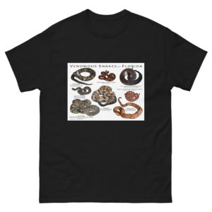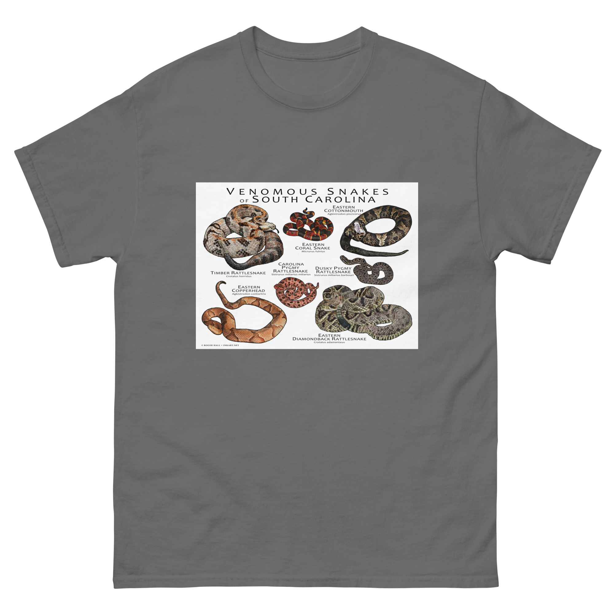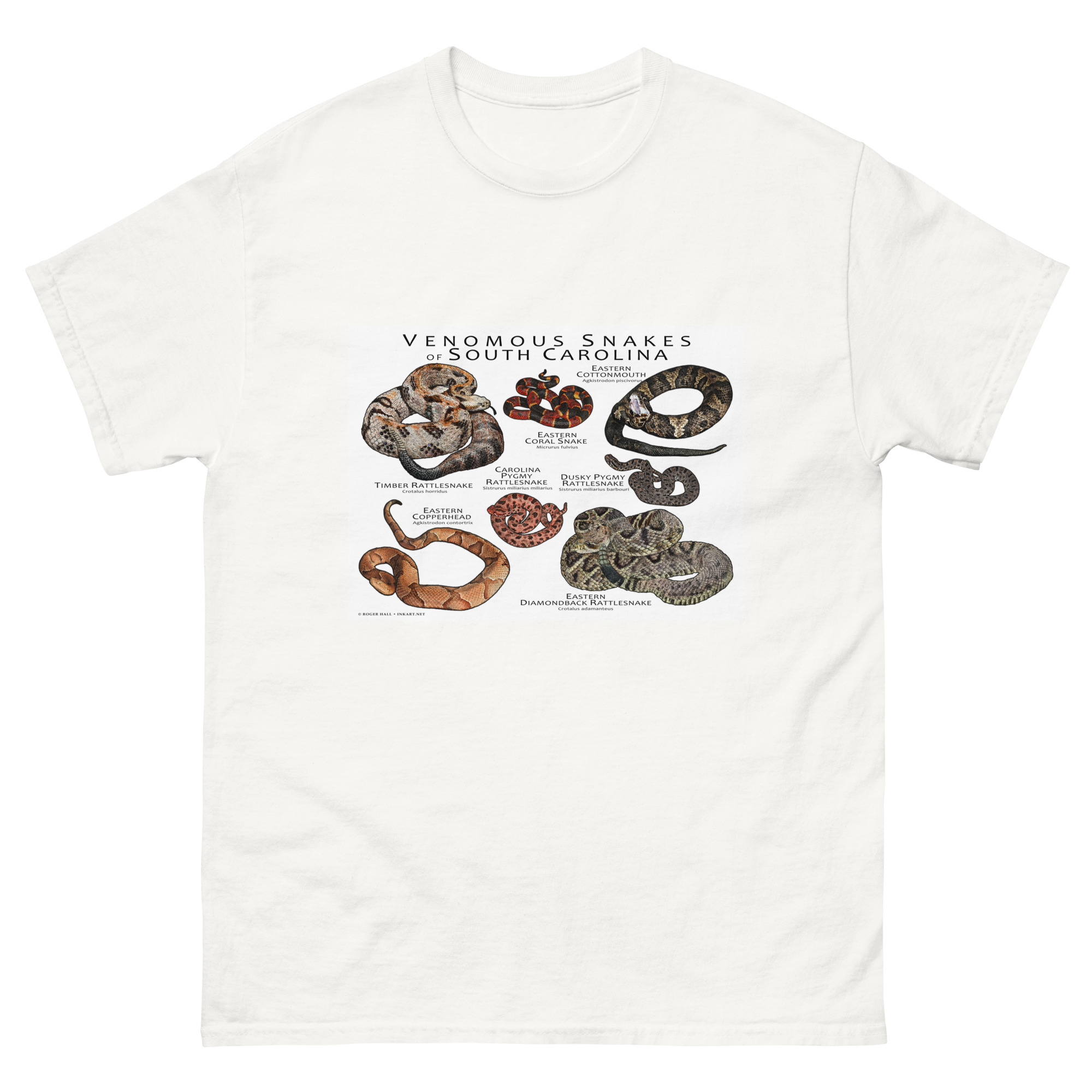There are seven species of venomous snakes found in the state of South Carolina in the US. While these snakes might have fearsome reputations, on average only few people in die each year in the United States from snake bites. This artwork features fine art illustrations of the all venomous snake species native to South Carolina printed in a high-quality men’s cotton t-shirt.