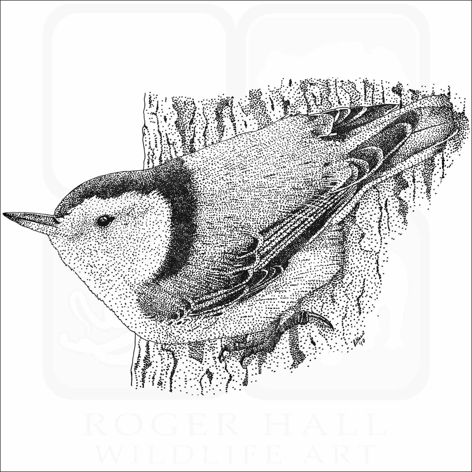 Fine art illustration of a White-Breasted Nuthatch (Sitta carolinensis.) The illustration is available in black and white or color.