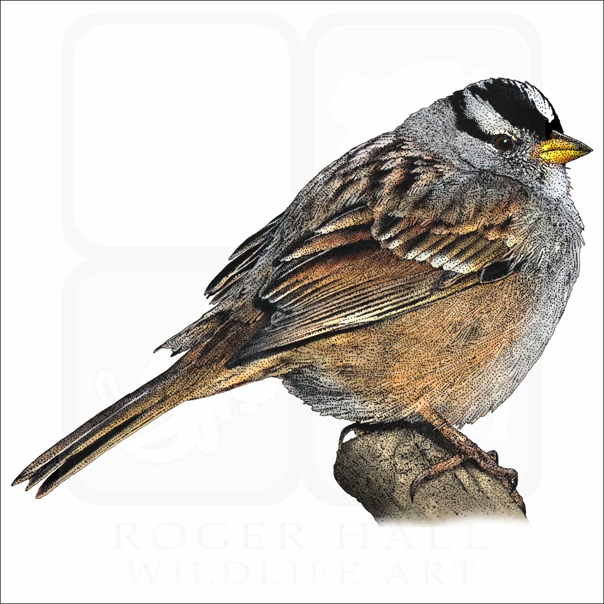 Fine art illustration of a White-Crowned Sparrow (Zonotrichia leucophrys.) The illustration is available in black and white or color.