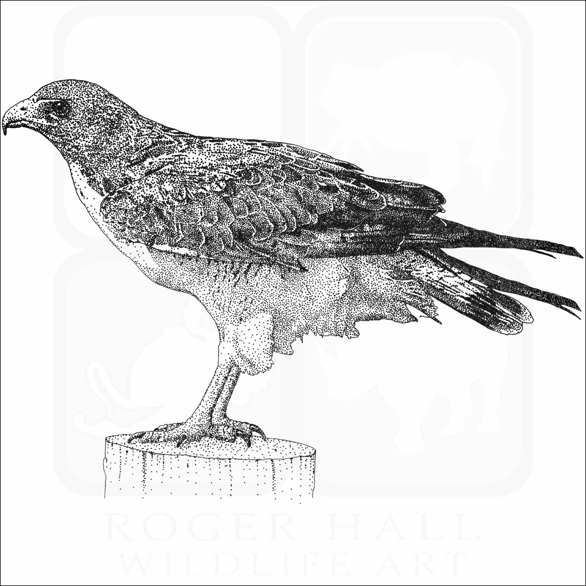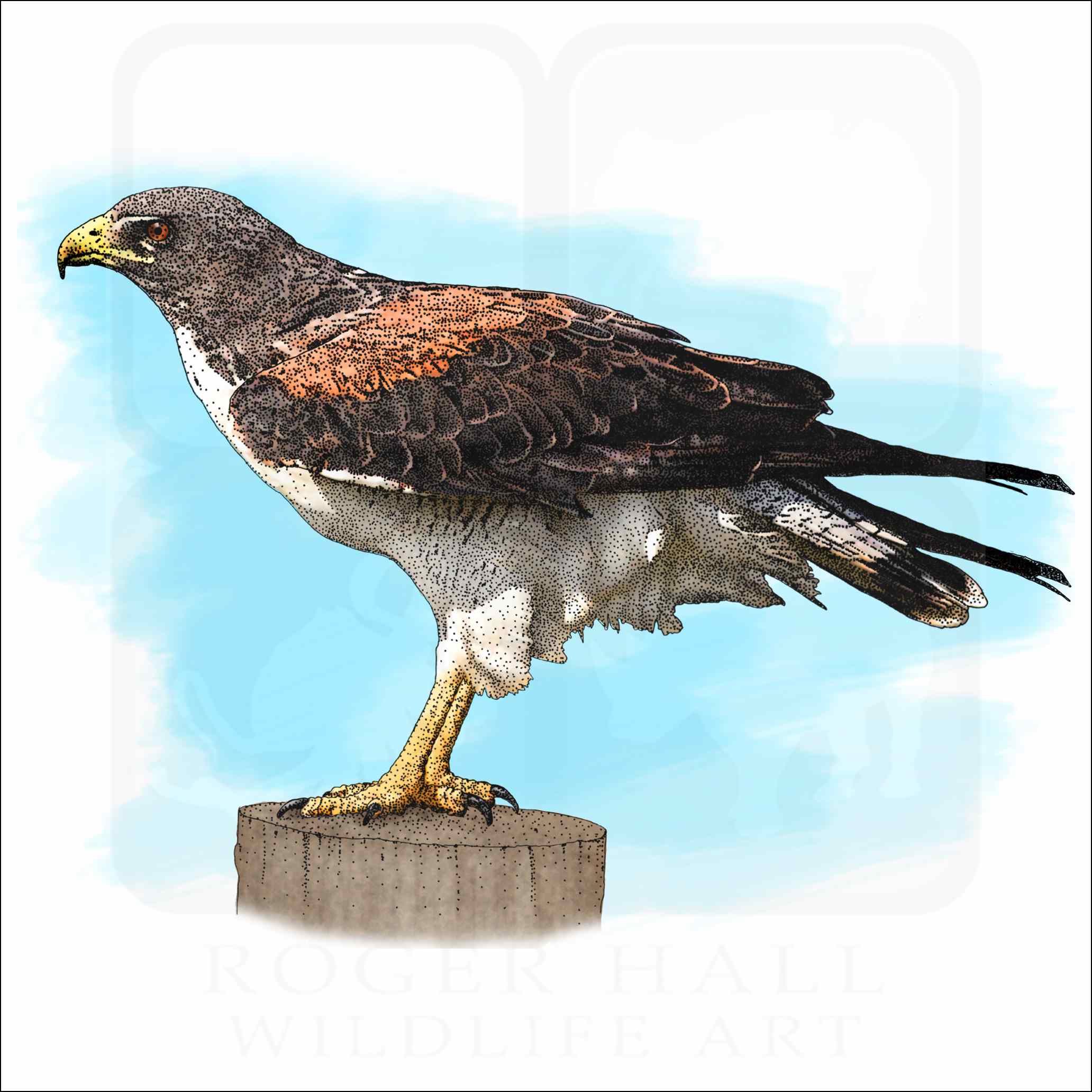 Fine art illustration of a White-Tailed Hawk (Geranoaetus albicaudatus.) The illustration is available in black and white or color.