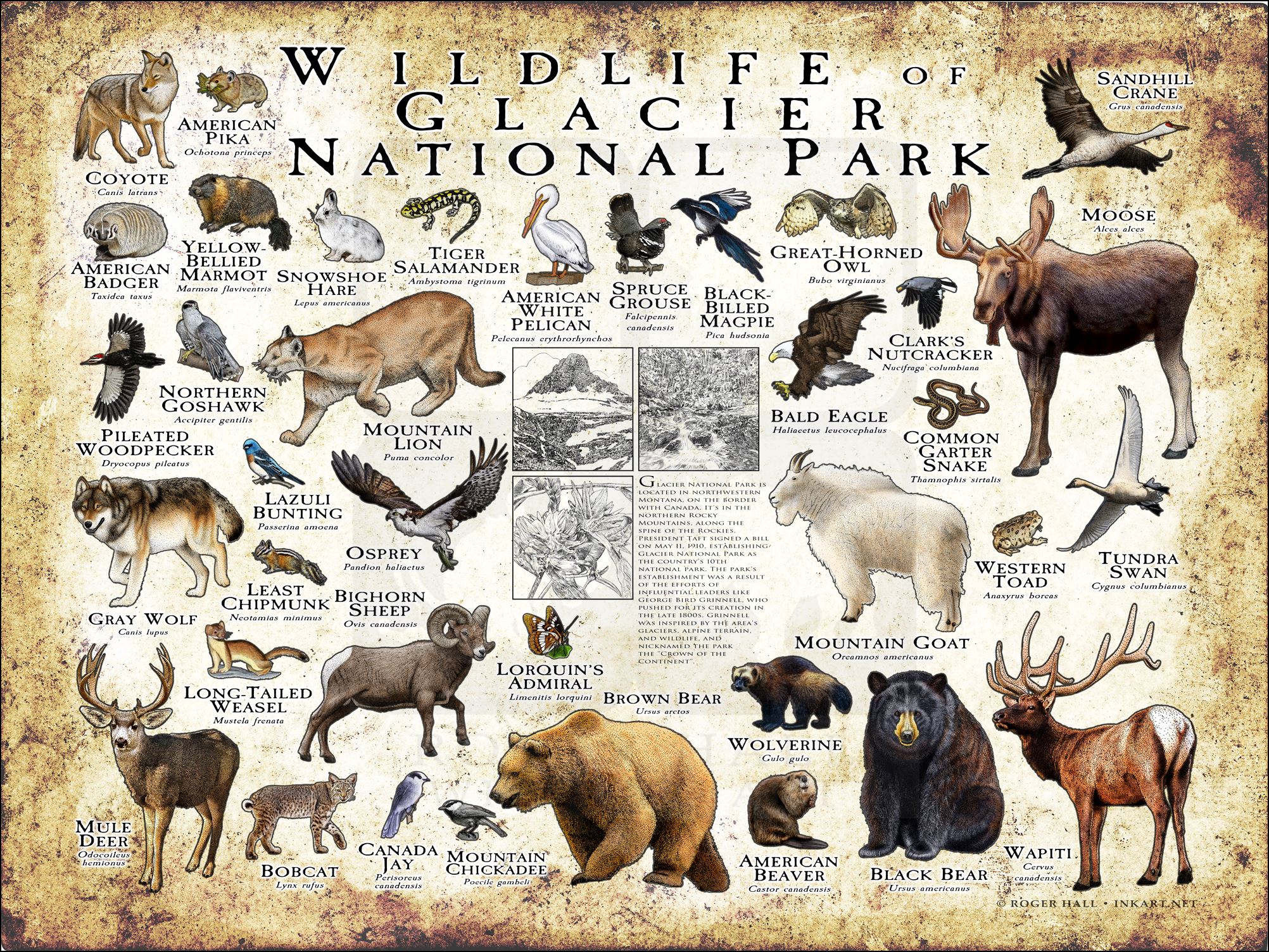 AMERICAN BADGER Taxidea taxus • AMERICAN BALD EAGLE Haliaeetus leucocephalus • AMERICAN BEAVER Castor canadensis • AMERICAN BLACK BEAR Ursus americanus • AMERICAN PIKA Ochotona princeps • AMERICAN WHITE PELICAN Pelecanus erythrorhynchos • BLACK- BILLED MAGPIE Pica hudsonia • BOBCAT Lynx rufus • CANADA JAY Perisoreus canadensis • CLARK’S NUTCRACKER Nucifraga columbiana • COUGAR Puma concolor • COYOTE Canis latrans • GRAY WOLF Canis lupus • GREAT-HORNED OWL Bubo virginianus • LAZULI BUNTING Passerina amoena • LEAST CHIPMUNK Neotamias minimus • LONG-TAILED WEASEL Mustela frenata • LORQUIN’S ADMIRAL Limenitis lorquini • MOOSE Alces alces • MOUNTAIN CHICKADEE Poecile gambeli • MULE DEER Odocoileus hemionus • NORTHERN GOSHAWK Accipiter gentilis • OSPREY Pandion haliaetus • PILEATED WOODPECKER Dryocopus pileatus • ROCKY MOUNTAIN GOAT Oreamnos americanus • ROCKY MOUNTAIN BIGHORN SHEEP Ovis canadensis • SANDHILL CRANE Grus canadensis • SNOWSHOE HARE Lepus americanus • TIGER SALAMANDER Ambystoma tigrinum • TUNDRA SWAN Cygnus columbianus • WAPITI Cervus canadensis • WESTERN TOAD Anaxyrus boreas • WOLVERINE Gulo gulo • YELLOW- BELLIED MARMOT Marmota flaviventris