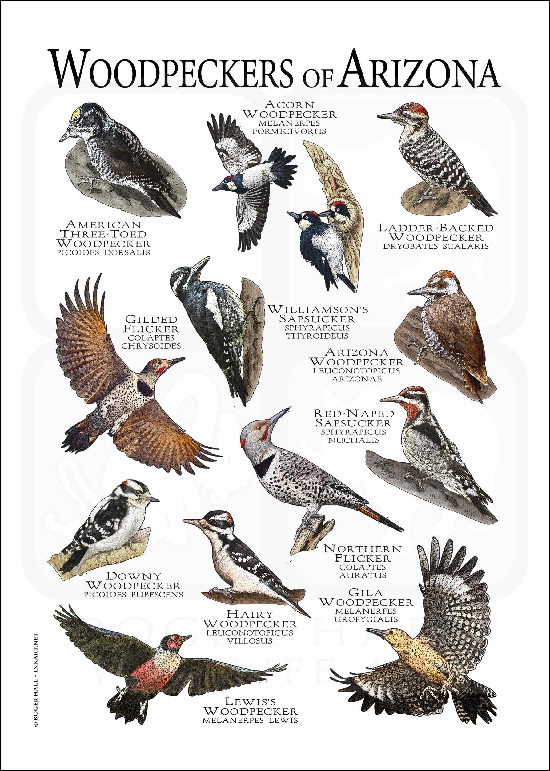 A colorful collage of scientifically accurate illustration of all species of woodpecker native to the US state of Arizona. The layout features fifteen different types of these wonderful birds, including some of the most continent’s most beautiful and colorful species.